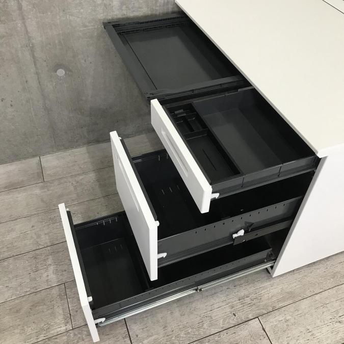 - 地震時、センター引出しが飛び出さないよう、ラッチ機構を装備。脚はデスクの横ズレを軽減させる設計になっています。