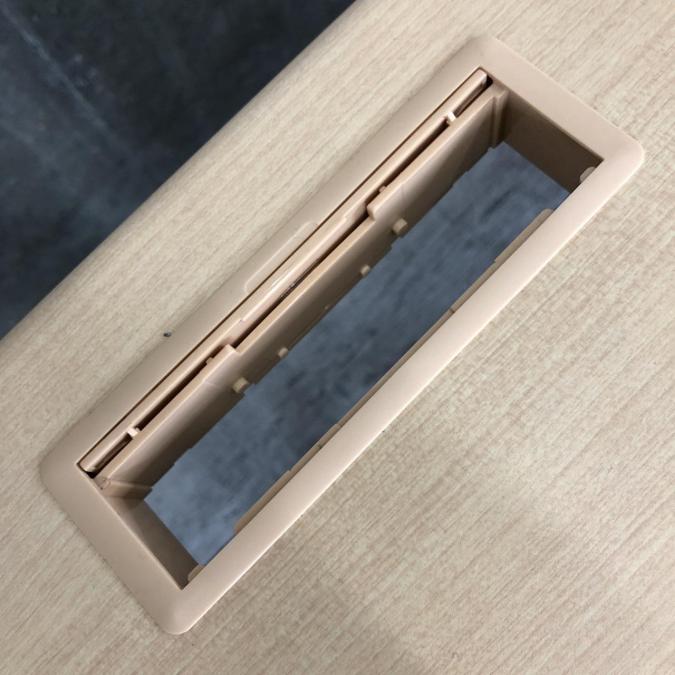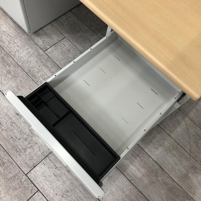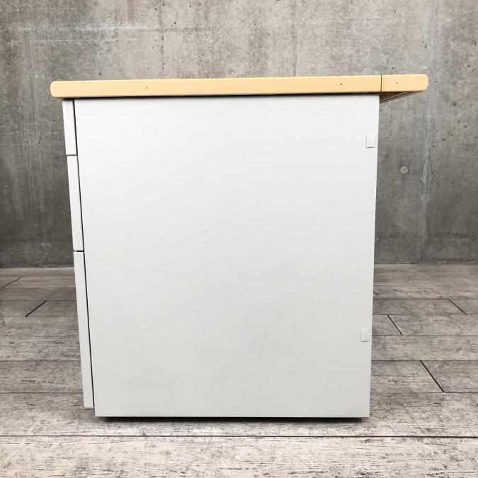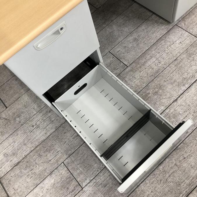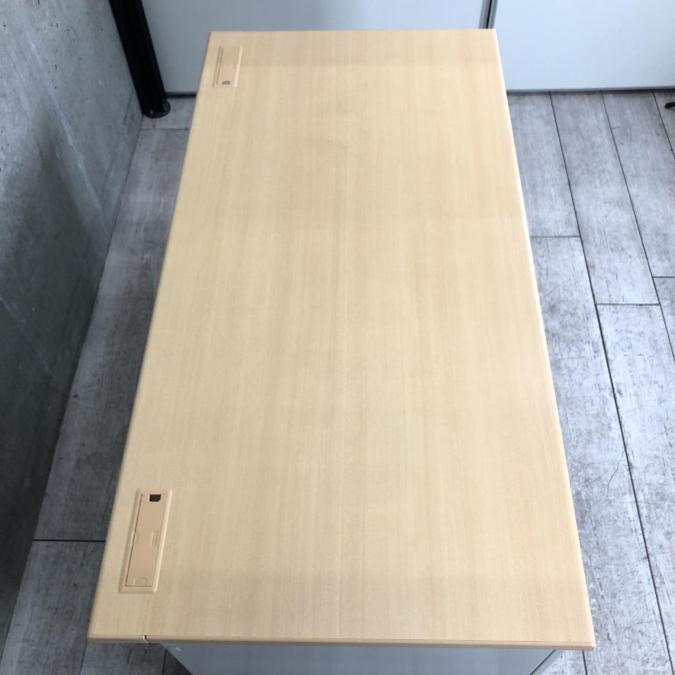 天板はナチュラルカラーの木目柄、袖引出しはニューグレーカラー。