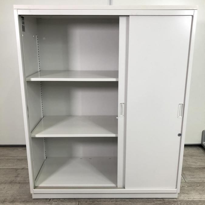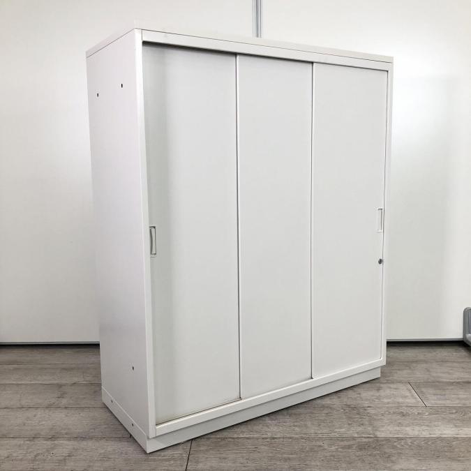 【スライド式なので開閉スペースに困りません!人気の3枚引き戸書庫!】■イトーキ (ITOKI)製 シンラインシリーズ 引き違い書庫 ローキャビネット 3枚引き戸 H1120㎜ ■天板付 ■ホワイト ■シリンダー錠