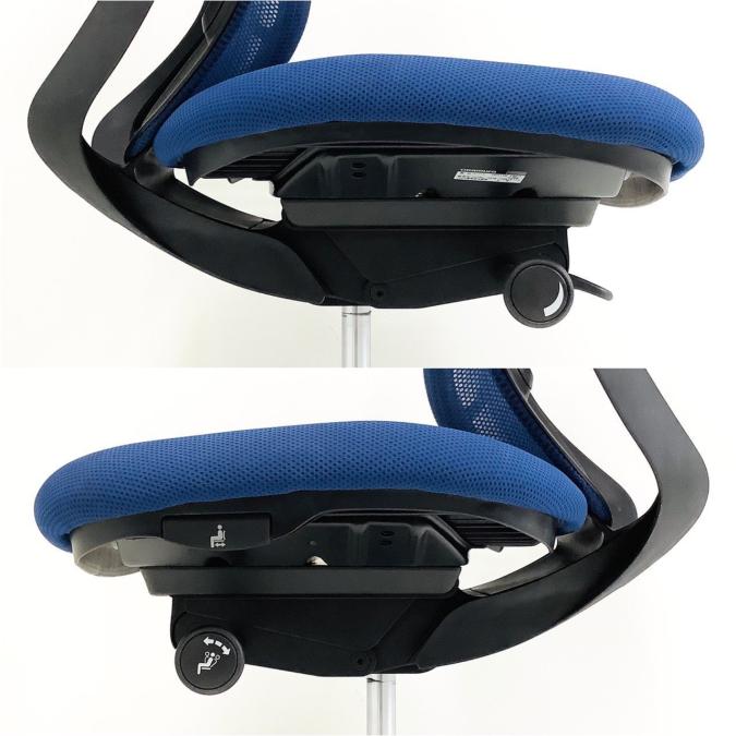 - 座面の左にあるレバー操作により、座面の奥行き調整が可能です。(ストローク:50mm)