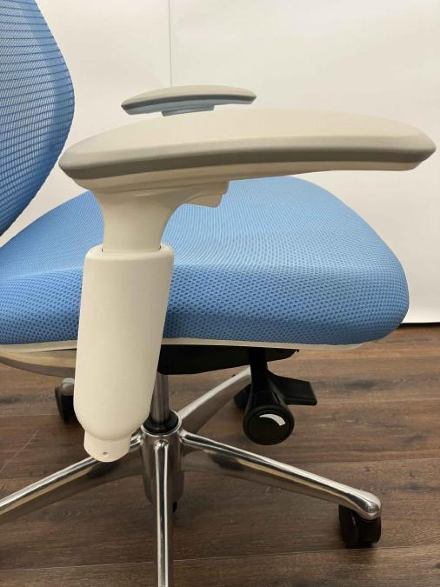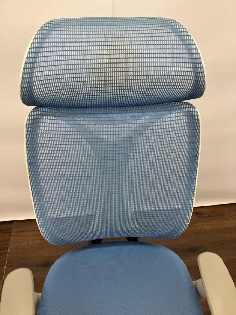 【T11】【T9】【K7】【商品入替のため、残り5脚限り】オカムラ製 サブリナシリーズ アクアブルー 背もたれ/アクアブルーx座面/ダークブルーのツートンカラー ホワイトフレーム アジャストアーム※可動肘 前傾チルト付 流れるような美しいフォルムの最高級メッシュチェア! 肘付きハイバックチェア!!