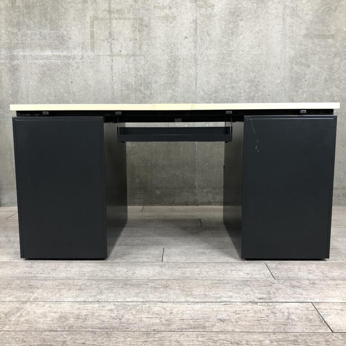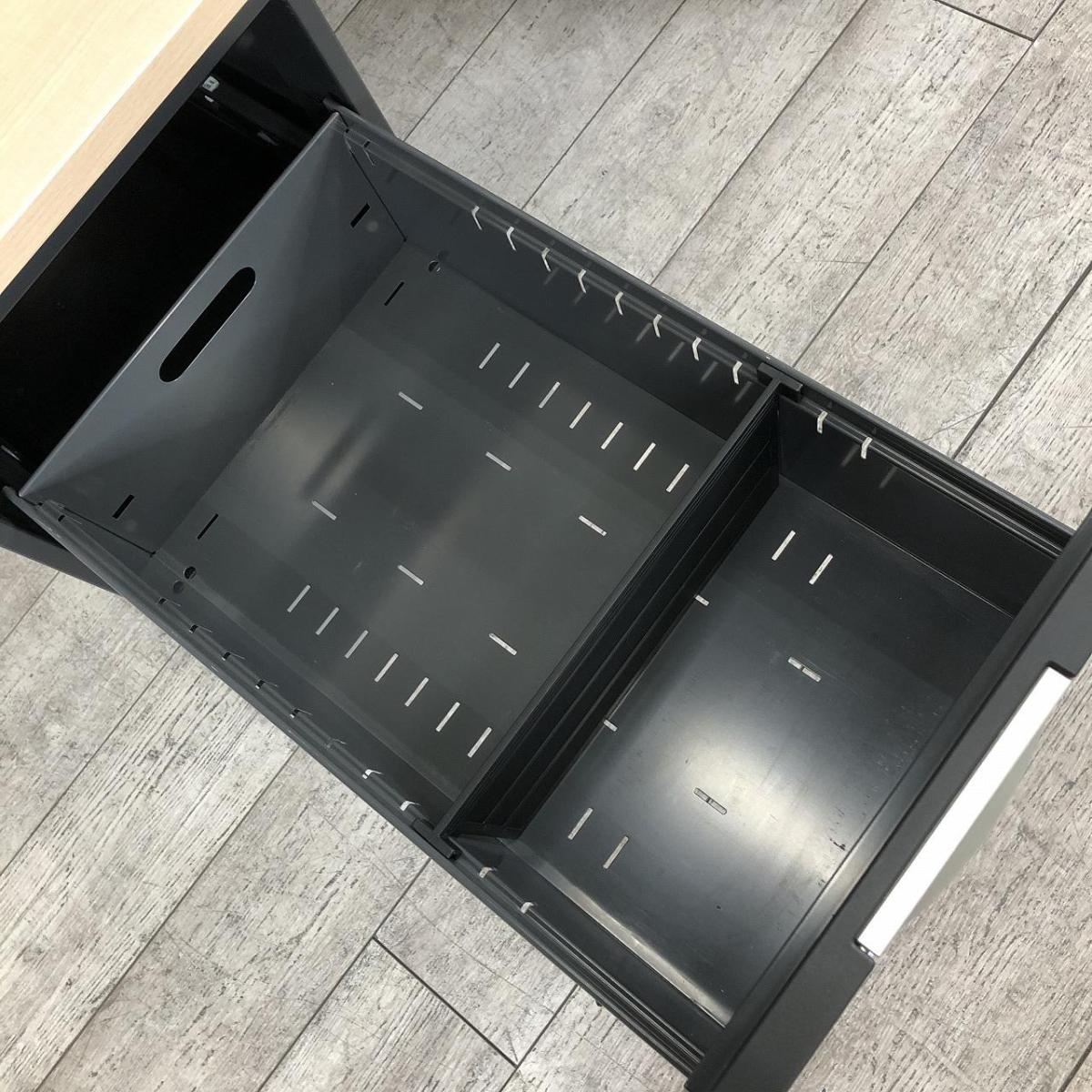 【スタイリッシュなデザインの両袖机!右側が引き出し式の棚のタイプ!】■コクヨ製 デルフィ 両袖デスク W1400mm ■左袖:2段 右袖:引き出し式棚 ■天板:ナチュラル 本体:シルバー&ブラック- つくば店