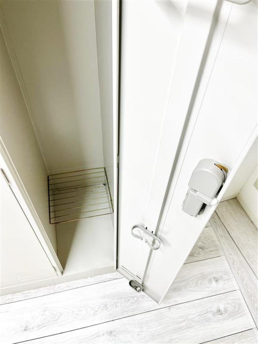 棚板付きで小物や下靴などは分けて収納可能、鍵はシリンダー錠で防犯対策もばっちり!