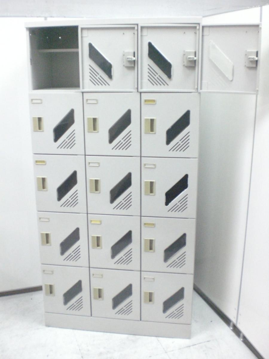 【入荷の珍しい15人用シューズボックス!小窓付き!】■オカムラ(okamura) シューズボックス・靴入れ・下駄箱 15人用 3列×5段 W900×D400 ■グレー ■鍵穴なし- つくば店