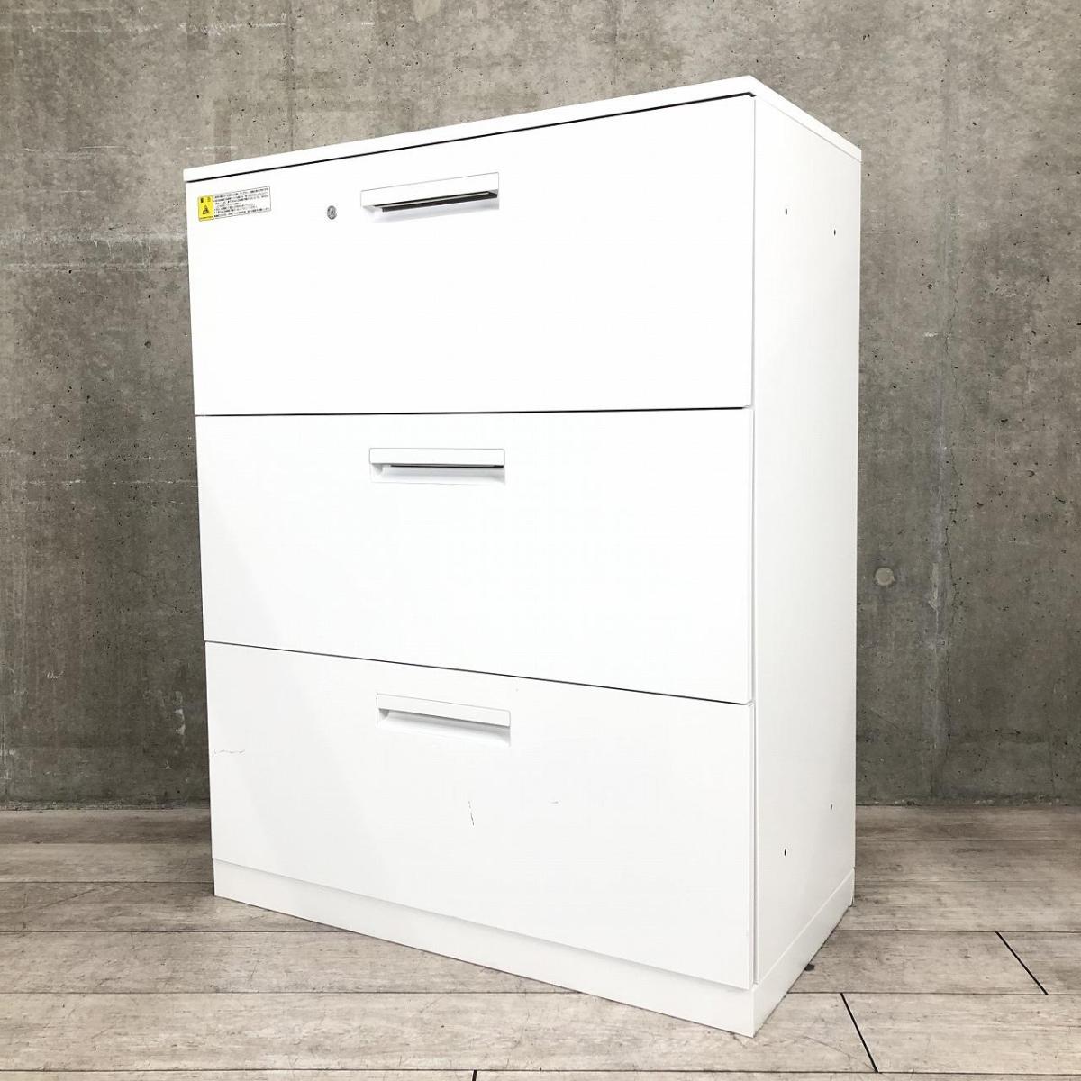 【ファイル収納に便利な引出し型キャビネット!】■ウチダ(UCHIDA) HSシリーズ 3段ラテラル書庫 ホワイト ※日焼け・キズありのためお安く!