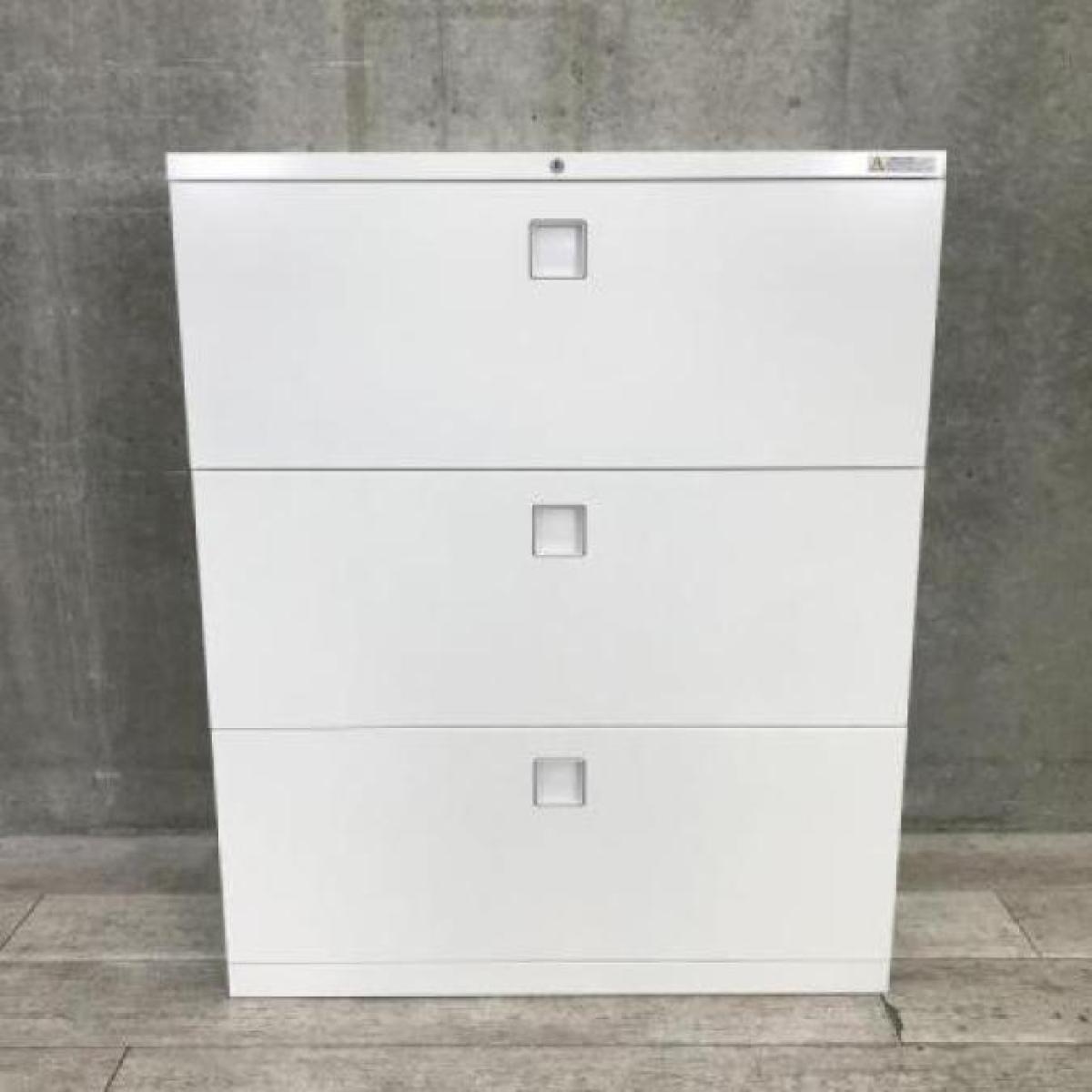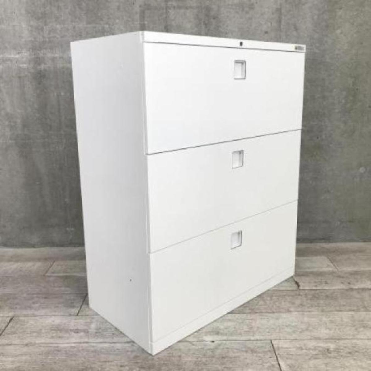 オカムラ レクトライン 3段ラテラル書庫 ホワイト天板 シリンダー錠 鍵付き ※取っ手部分に若干日焼けあり