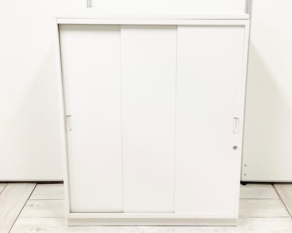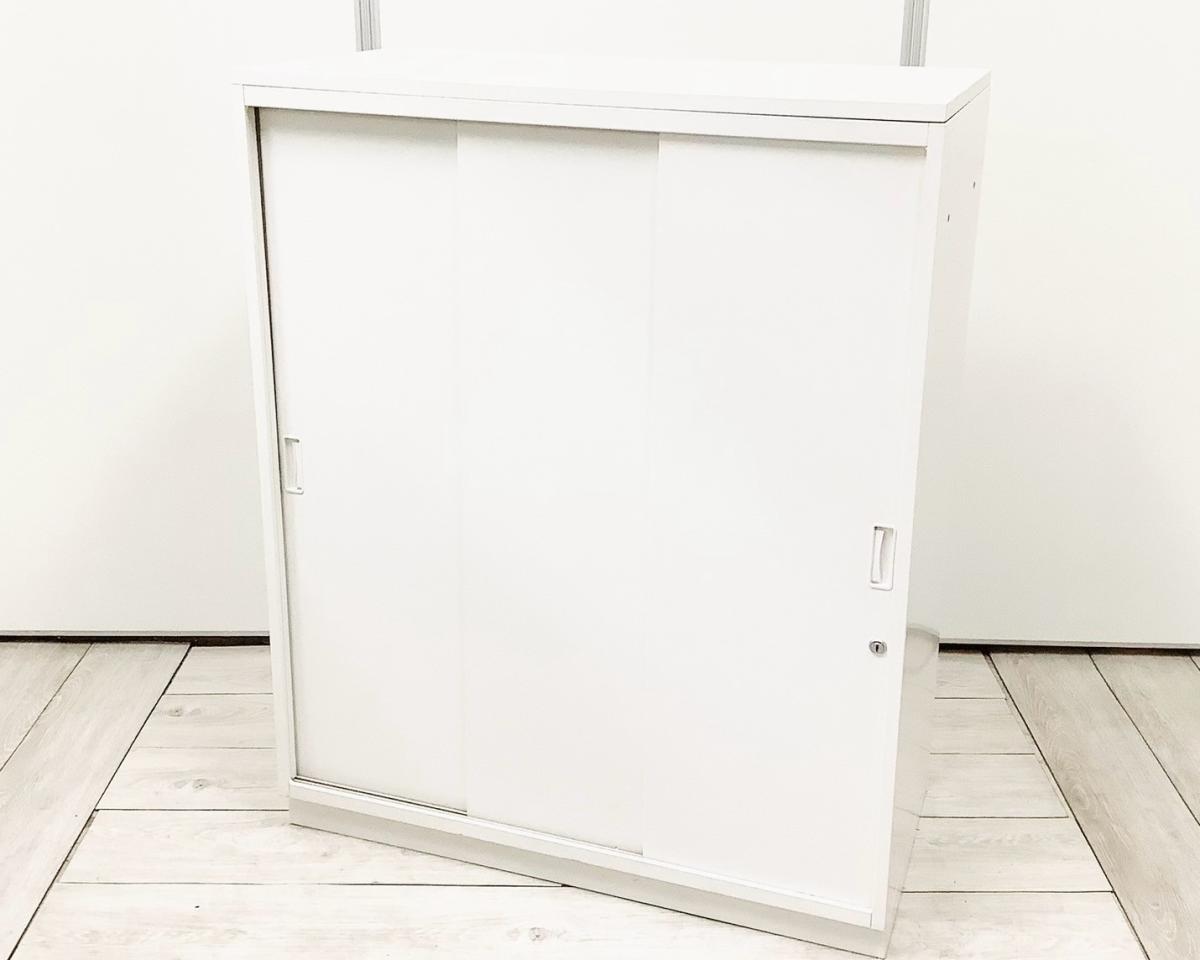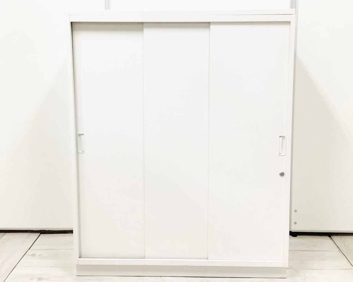【スライド式なので開閉スペースに困りません!人気の3枚引き戸書庫!】■イトーキ (ITOKI)製 シンラインシリーズ 引き違い書庫 ローキャビネット 3枚引き戸 H1120㎜ ■天板付 ■ホワイト ■シリンダー錠