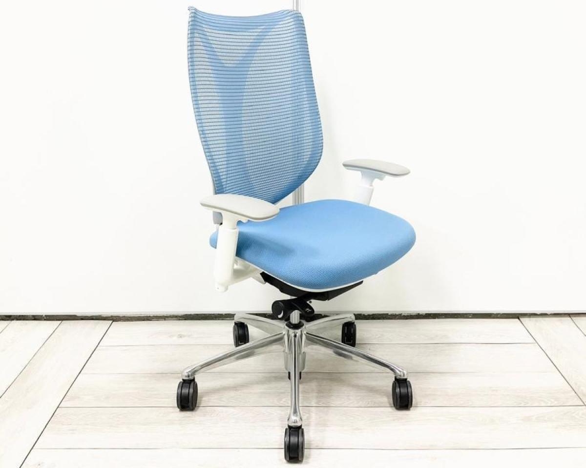 【在庫セール品】【定価約16万円】【前傾チルト付!流れるような美しいフォルムの最高級メッシュチェア!】■オカムラ(okamura)製 Sabrina(サブリナ) ハイバック 肘付き ■可動肘 ■背面メッシュ:アクアブルー/座面:ブルー×ホワイトフレーム【AD】