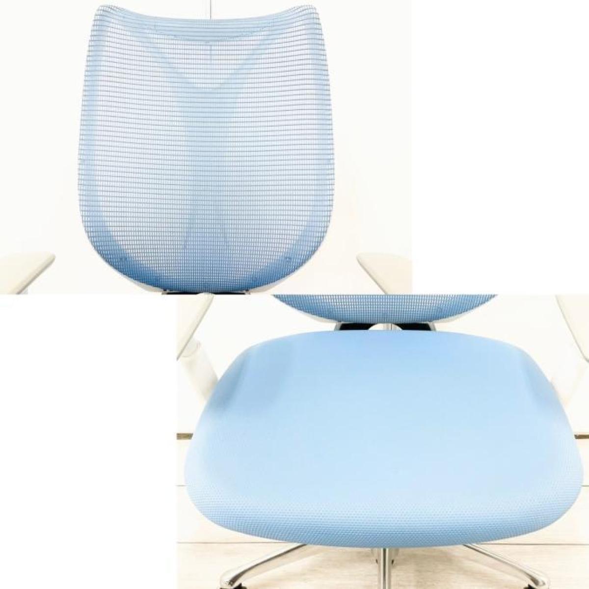 【T11】【T9】【K7】【商品入替のため、残り5脚限り】オカムラ製 サブリナシリーズ アクアブルー 背もたれ/アクアブルーx座面/ダークブルーのツートンカラー ホワイトフレーム アジャストアーム※可動肘 前傾チルト付 流れるような美しいフォルムの最高級メッシュチェア! 肘付きハイバックチェア!!