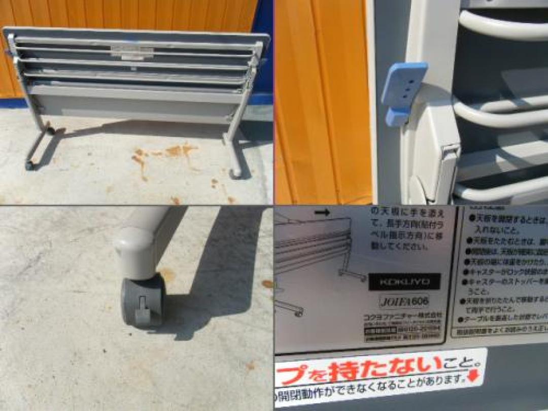 - 一部不具合あり天板歪み、アジャスター無し、キャスター使用不可ようなそのテーブルの本来の効用を果たすための機能以外の一部が使用不可な状態。(例、キャスターロッ ク機能使用不可、棚板無し等がある。)