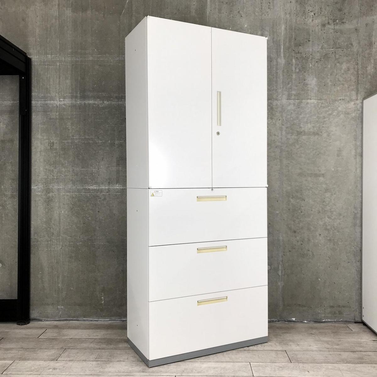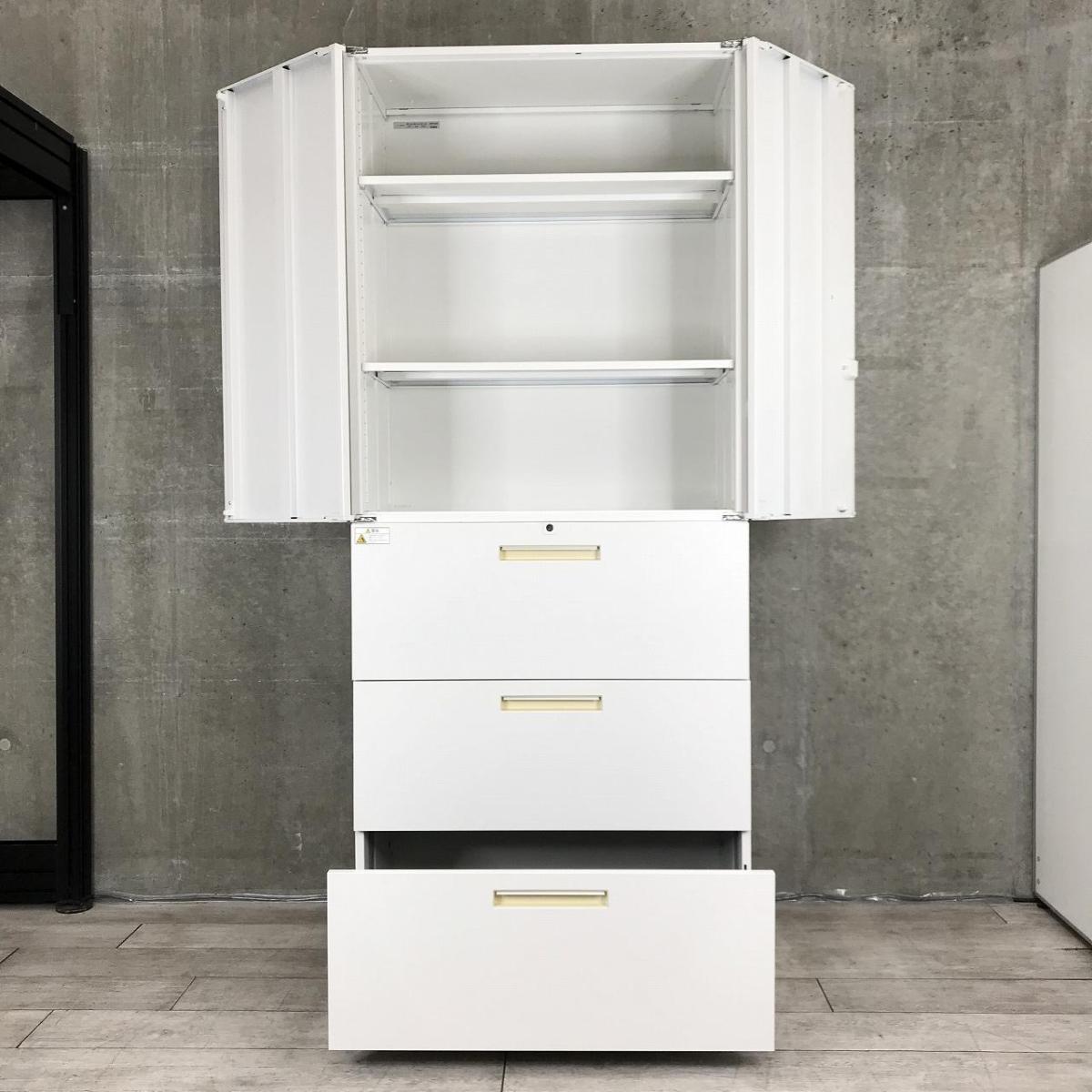 上段が両開き(観音開き)、下段が3段ラテラル(引き出し)書類整理や出し入れに最適な組合せ。