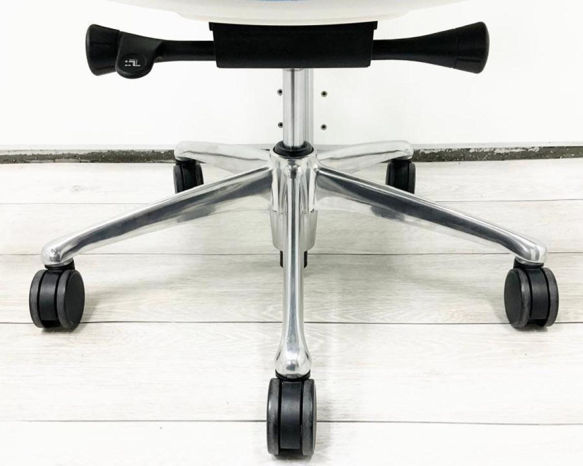 【前傾チルト付!流れるような美しいフォルムの最高級メッシュチェア!】■オカムラ(okamura)製 Sabrina(サブリナ) ハイバック 肘付き ■可動肘 ■背面メッシュ:アクアブルー 座面:ブルー ホワイトフレーム 【座面にダメージがあるためお値下げ商品】