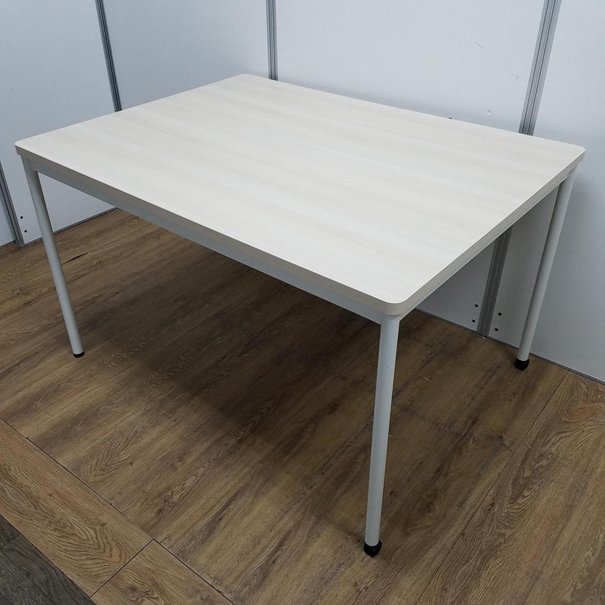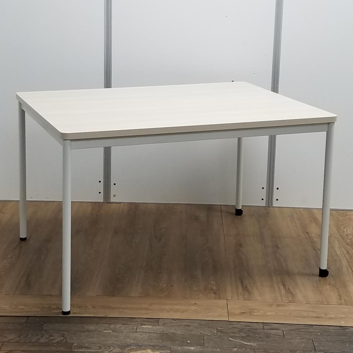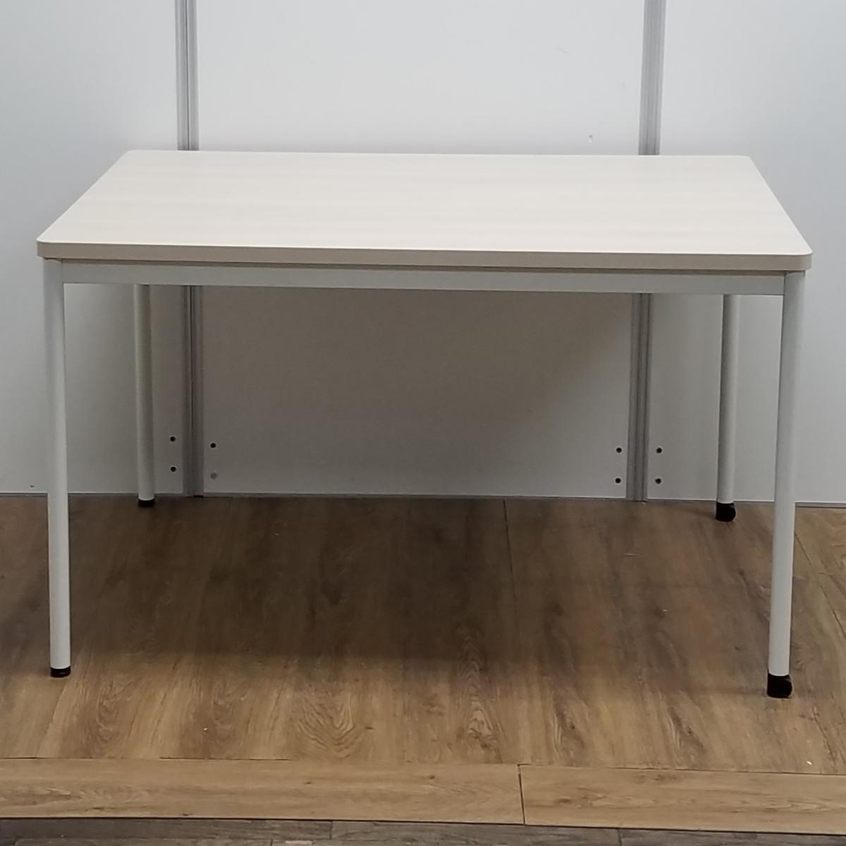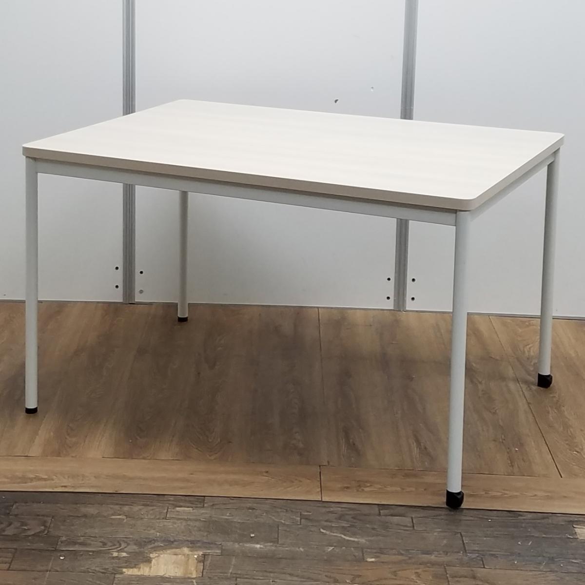 【商品入替のため、残り1台限り】オカムラ製 ライブスシリーズ 木目ナチュラル天板 4本ホワイト脚 W1200/D900サイズ 片側キャスター ナチュラル天板のワークテーブル! オシャレなカフェ風テーブルにも! W1200ミーティングテーブル!!- 京都東寺店