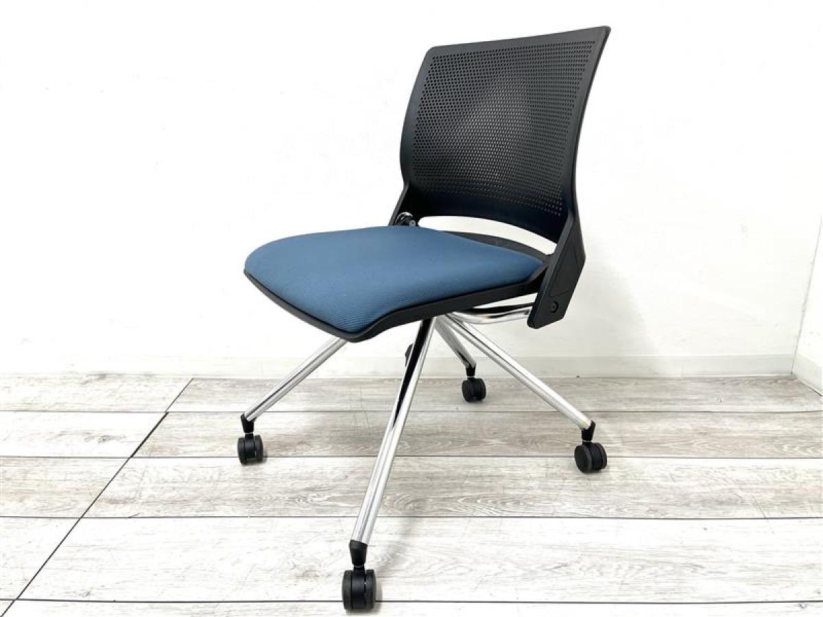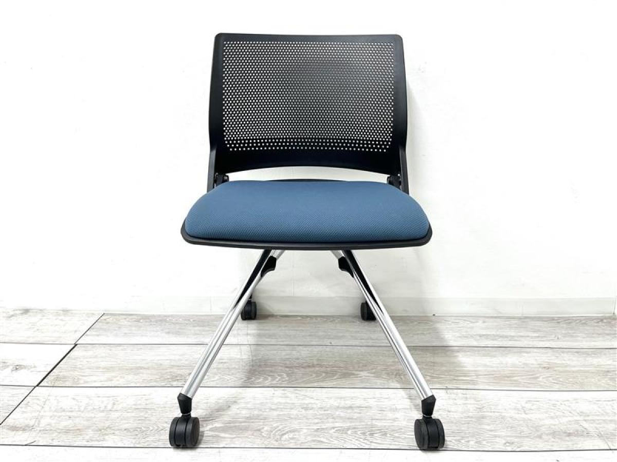 【定価約6万円】【座面折り畳み収納可能なネスティング】■オカムラ/クリール ■座面ミディアムブルー/背もたれブラック ■ネスティングチェア ■会議室/ミーティングルームなどにおすすめ!- 仙台店