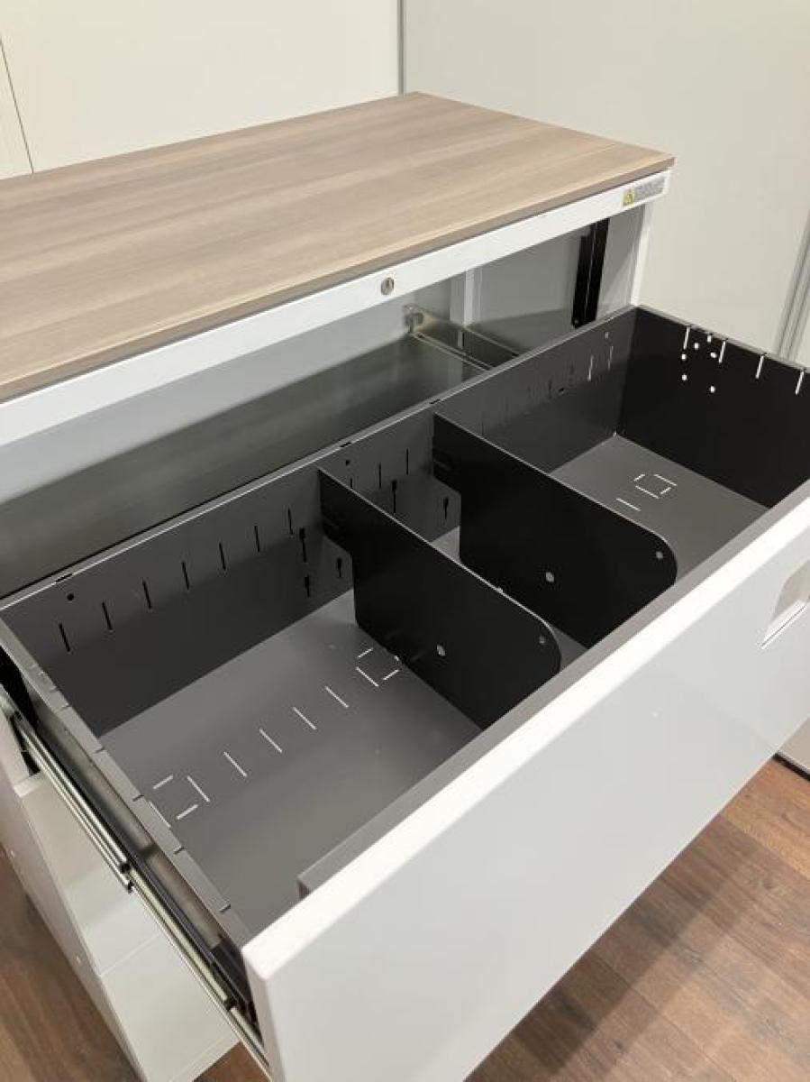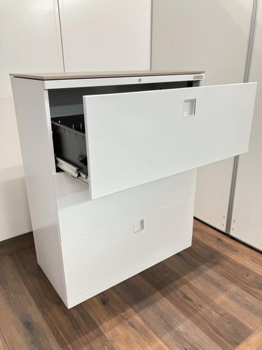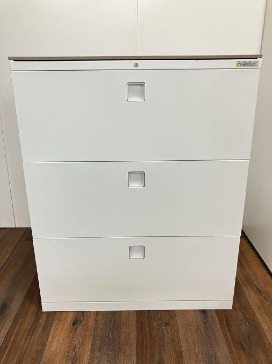 【使いやすさで選ぶならコレ!大容量の三段キャビネット】■オカムラ(Okamura)製 レクトラインシリーズ(Rectline) 3段ラテラル書庫 ローキャビネット ■天板付き ■シリンダー錠 ■ホワイト