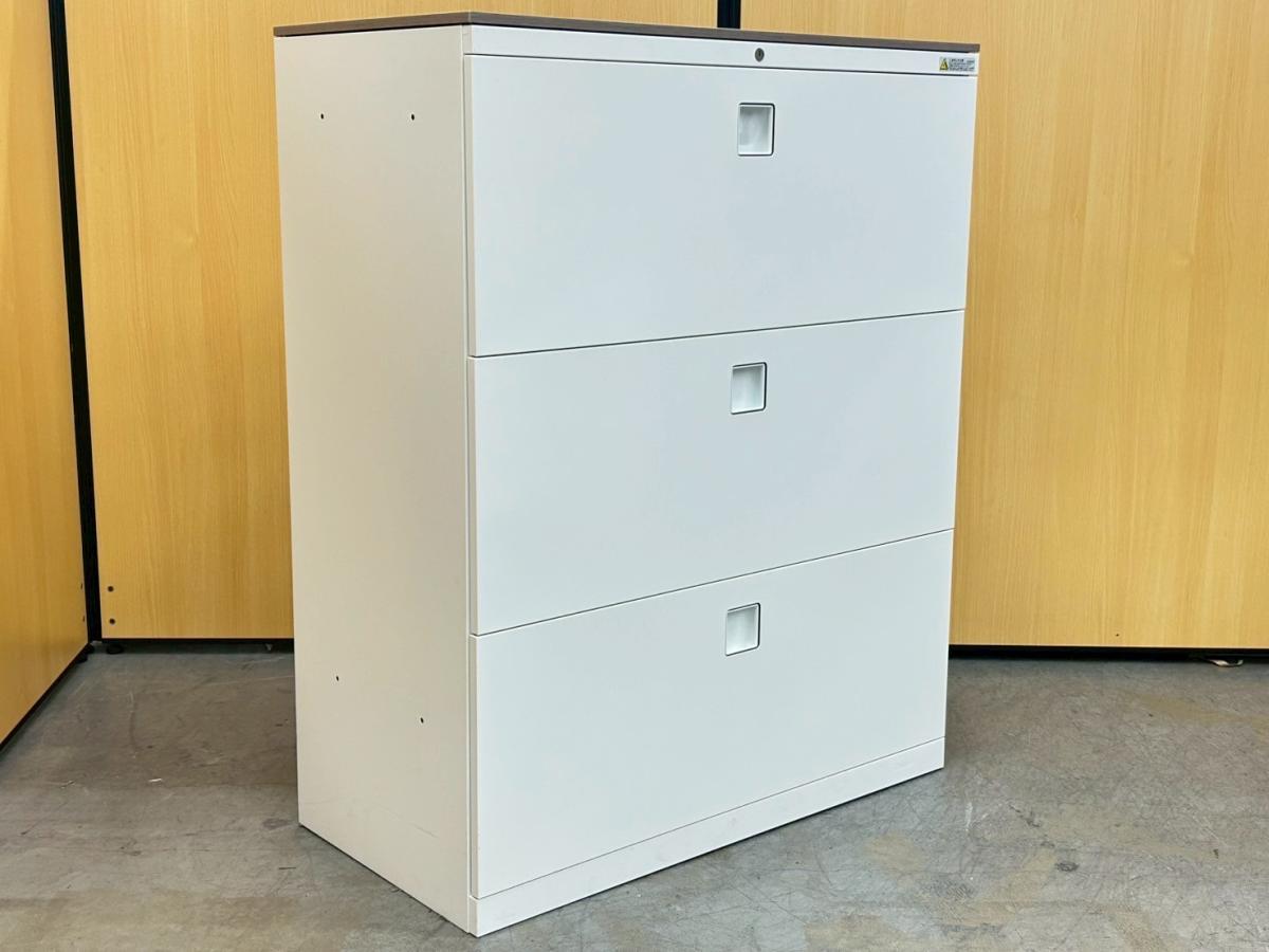 【ファイル収納にオススメ!高品質で使いやすい人気シリーズの3段ラテラル書庫!】■オカムラ(okamura)製 レクトラインシリーズ 3段ラテラル書庫 ローキャビネット H1100㎜ ■ホワイト ■シリンダー鍵 ■天板付き(天板:ホワイト) ※日焼け有