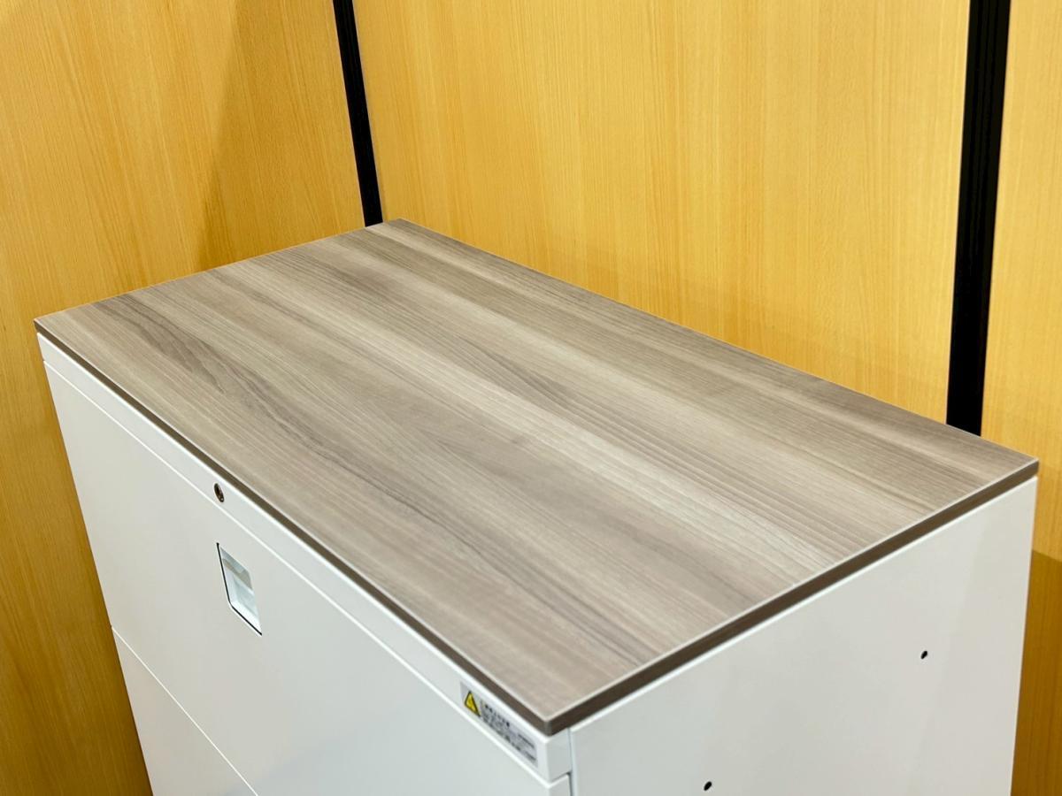 【オシャレな木目天板!大容量の三段キャビネット】■オカムラ(okamura) レクトラインシリーズ 3段ラテラル書庫 ■木天板付き(プライズウッドミディアム) ■ホワイト【天板付きなのでカウンターとしても使える!】【弊社使用欄:A01009439】サーキュラーバリューCO2削減量の算出について