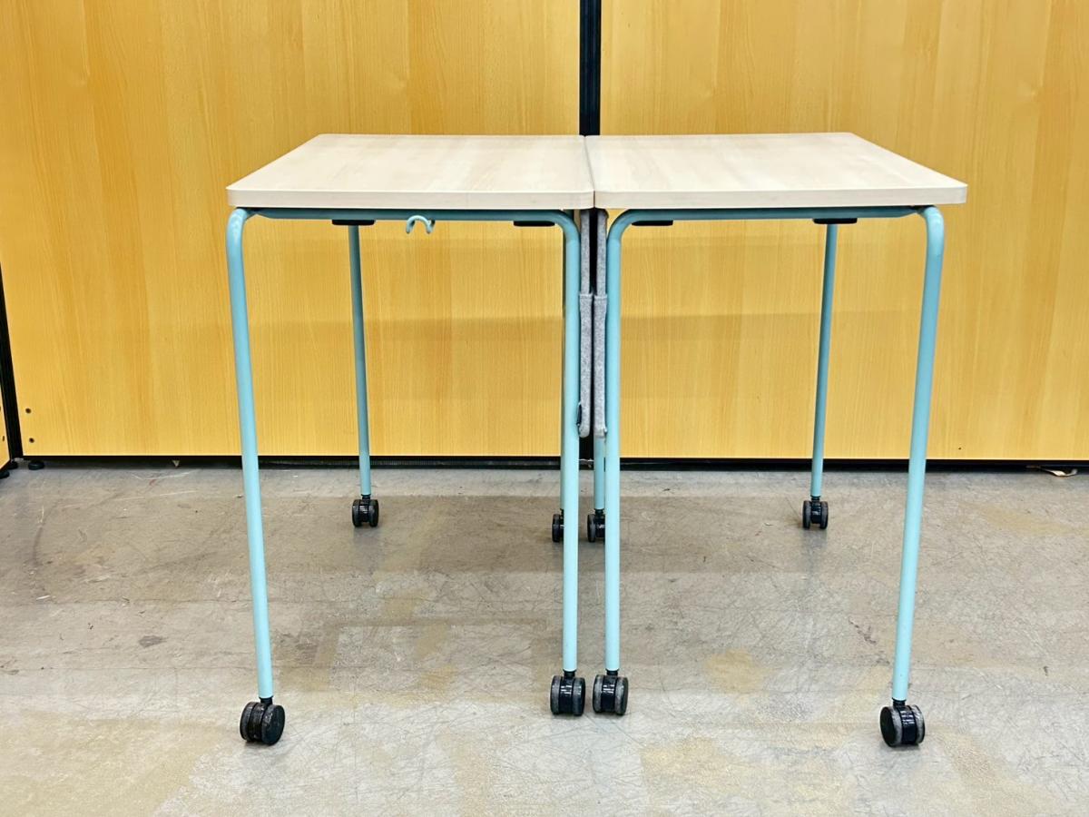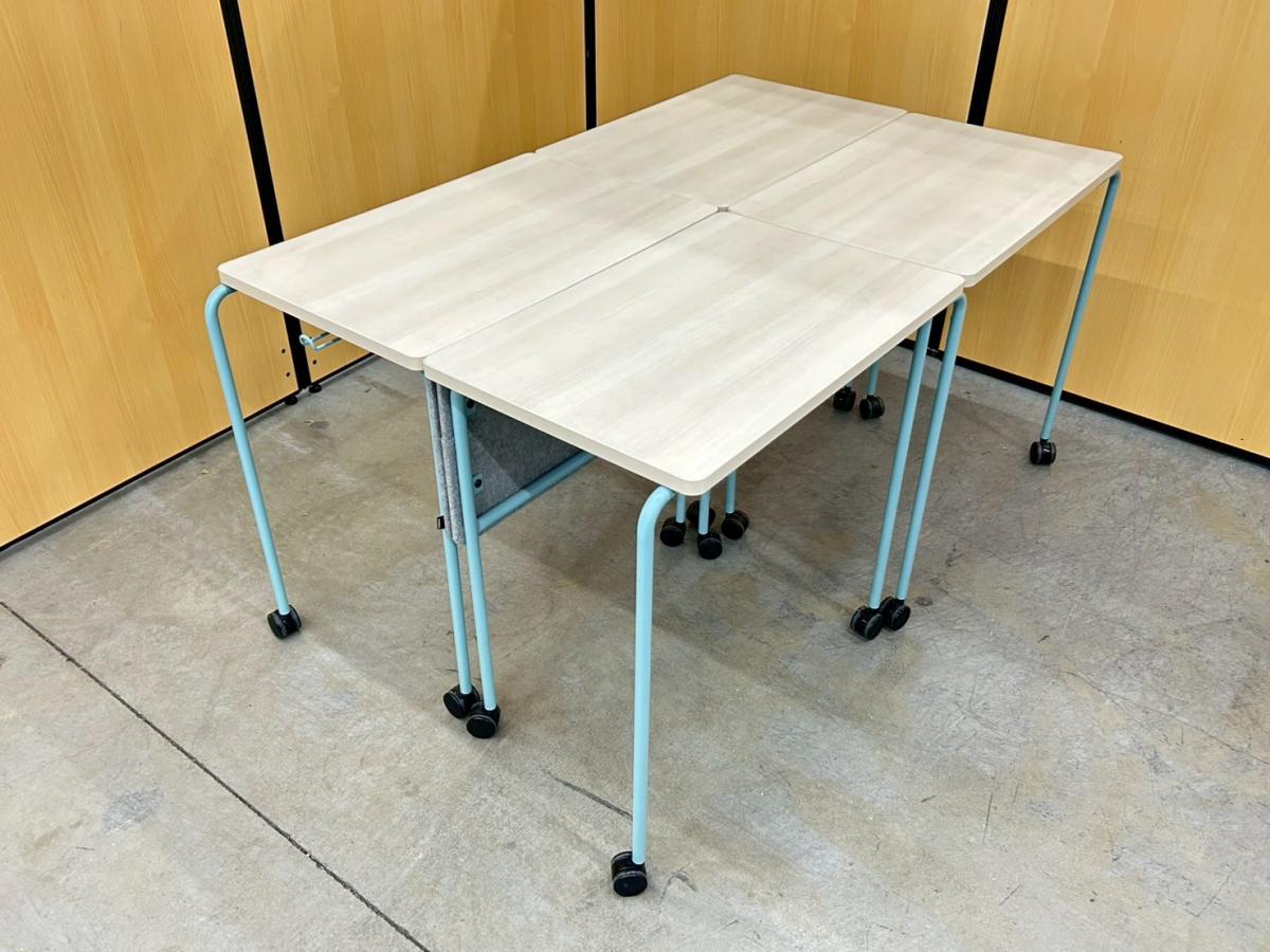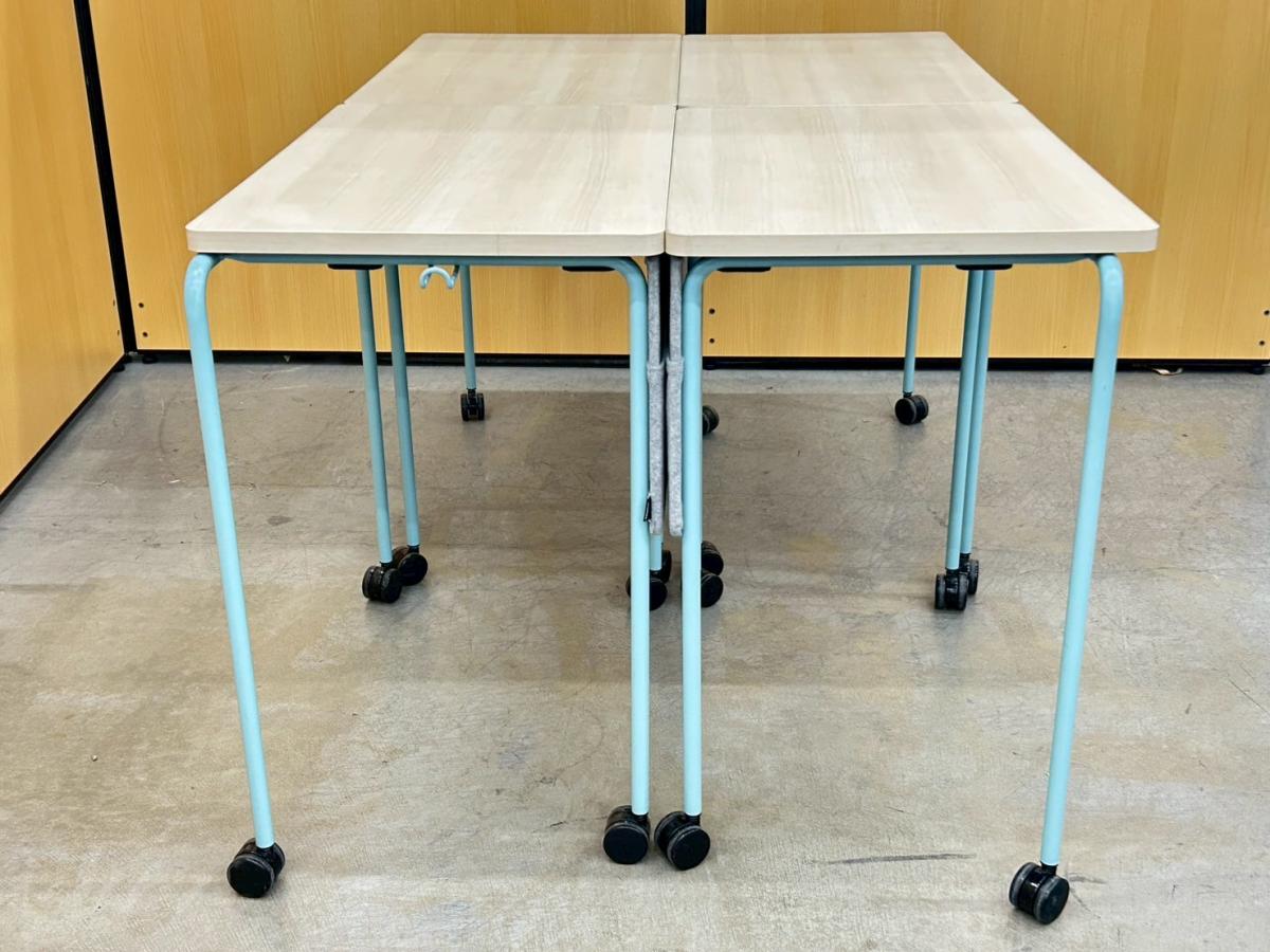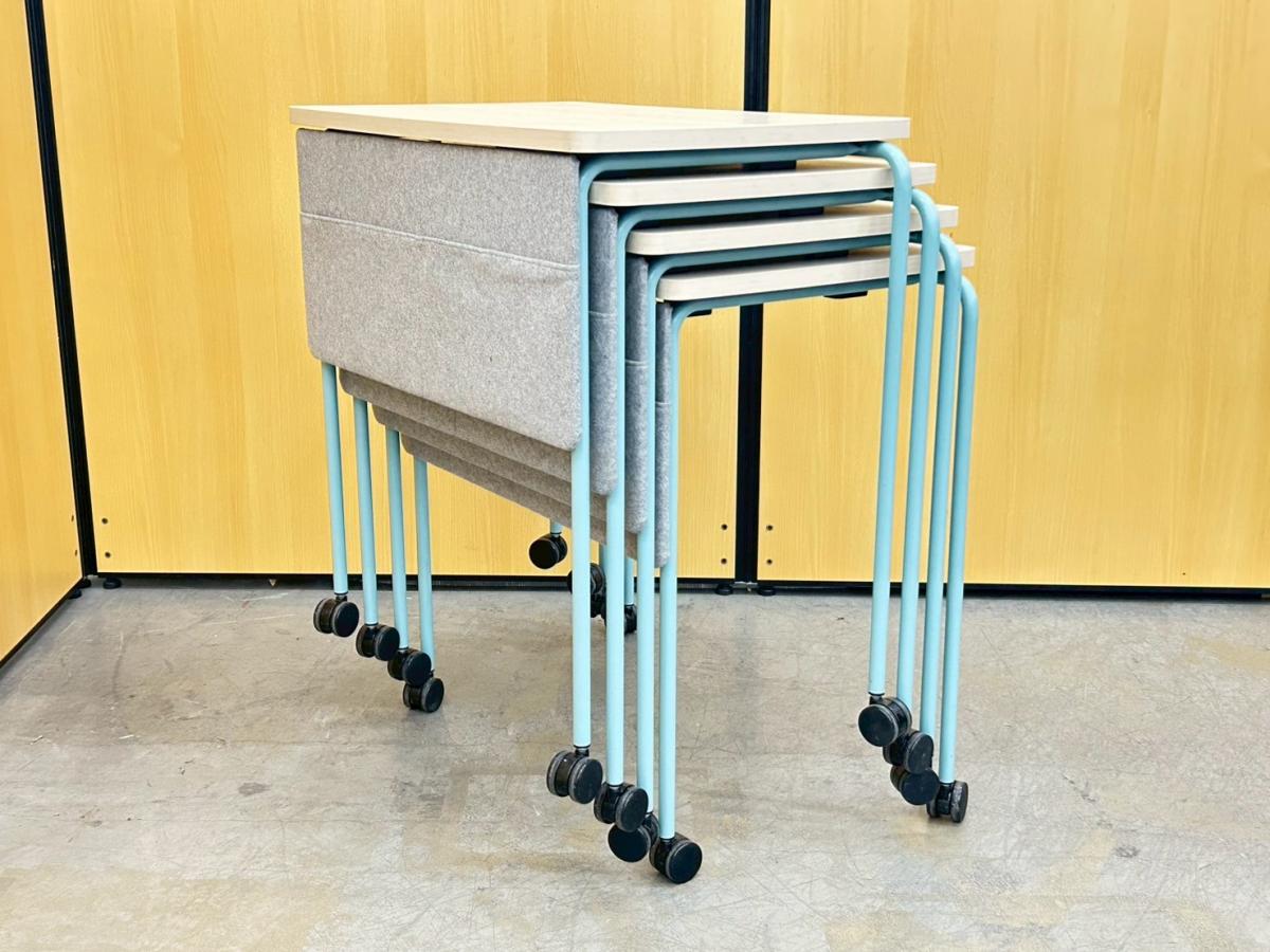【キャスター付でフレキシブルに使えます!4台まで積み重ねも可能!】■4台セット販売 ■オカムラ(okamura)製 スプリントテーブル ■木目ナチュラル×ブルー脚 ■幕板付 ■キャスター付【弊社使用欄:A01009341】- 在庫数