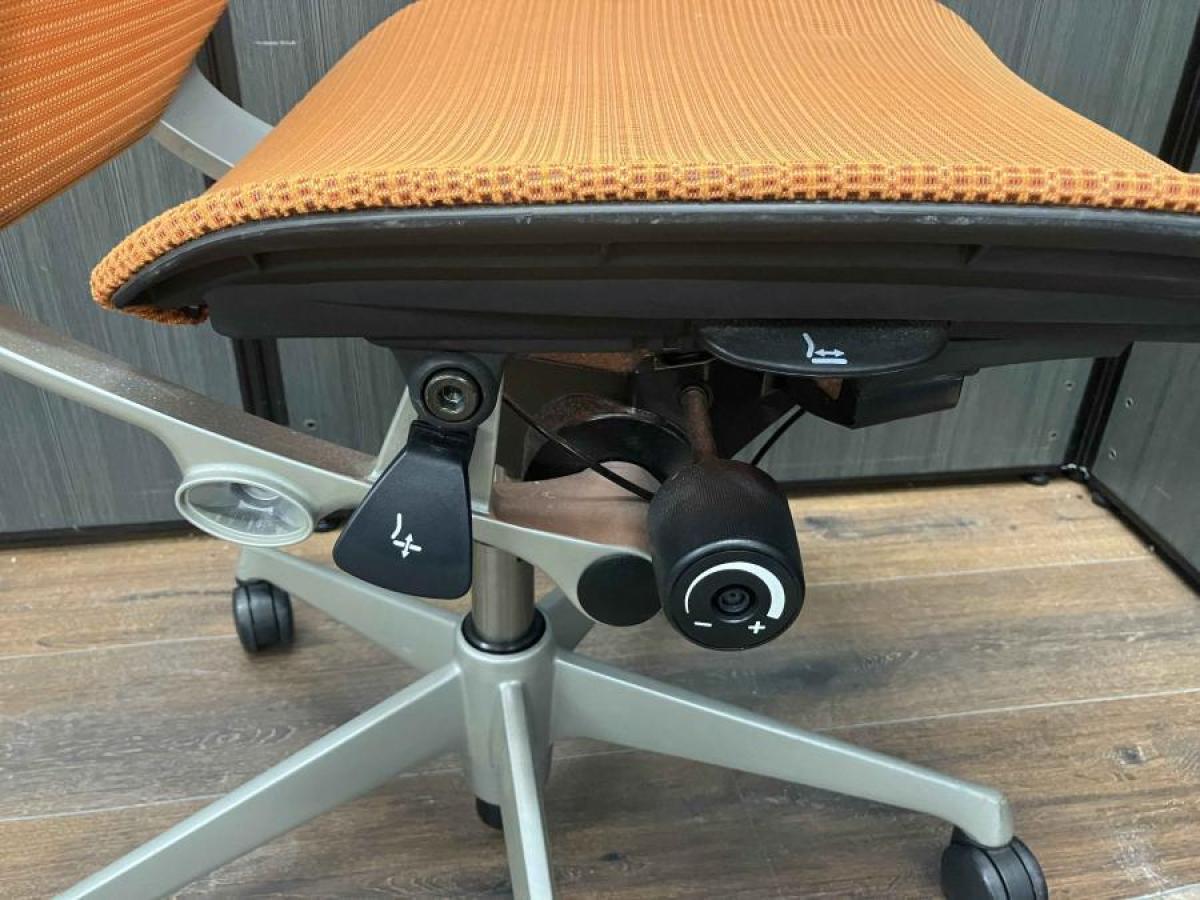 座面のすぐ右下にあるレバーの操作により、座面位置の上下調整(100mm)が可能です。