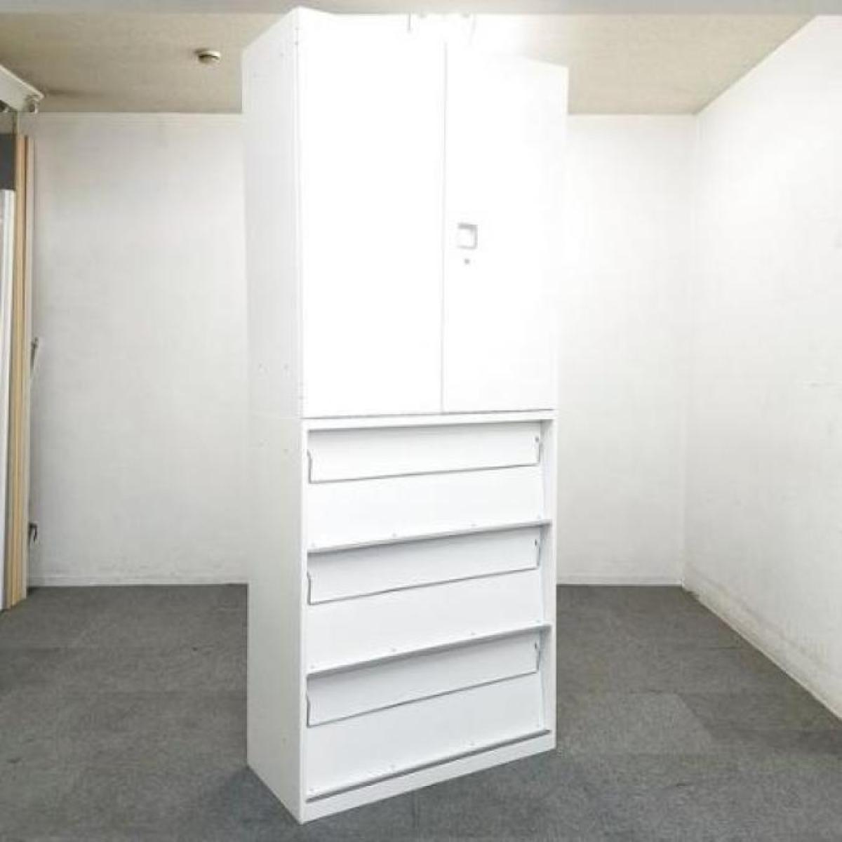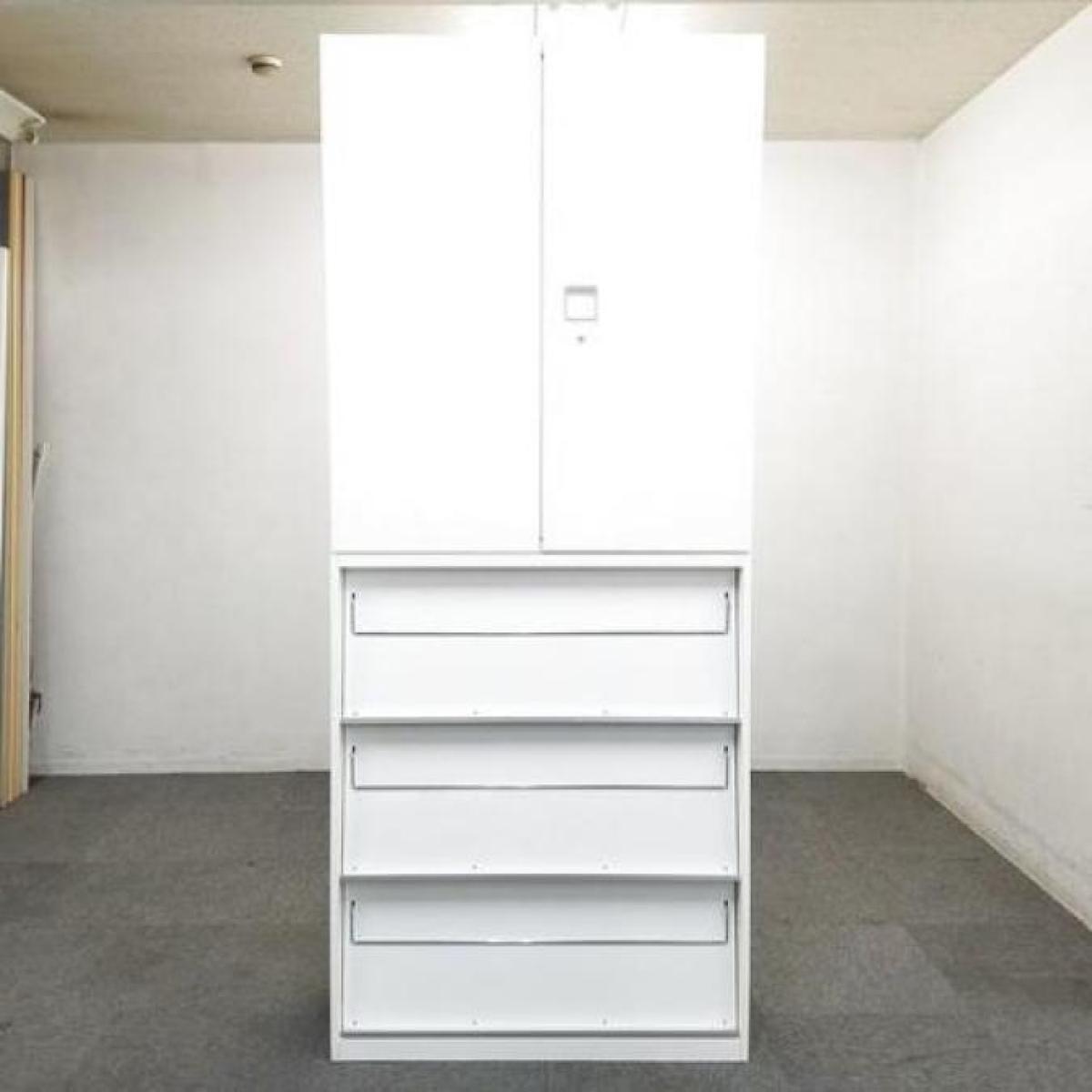 スライド式の扉+引き出しタイプの便利な書庫セットが入荷!使い勝手抜群のハイキャビネットが入荷! ■オカムラ/レクトライン/ホワイト 2枚引き戸+3段ラテラルキャビネット