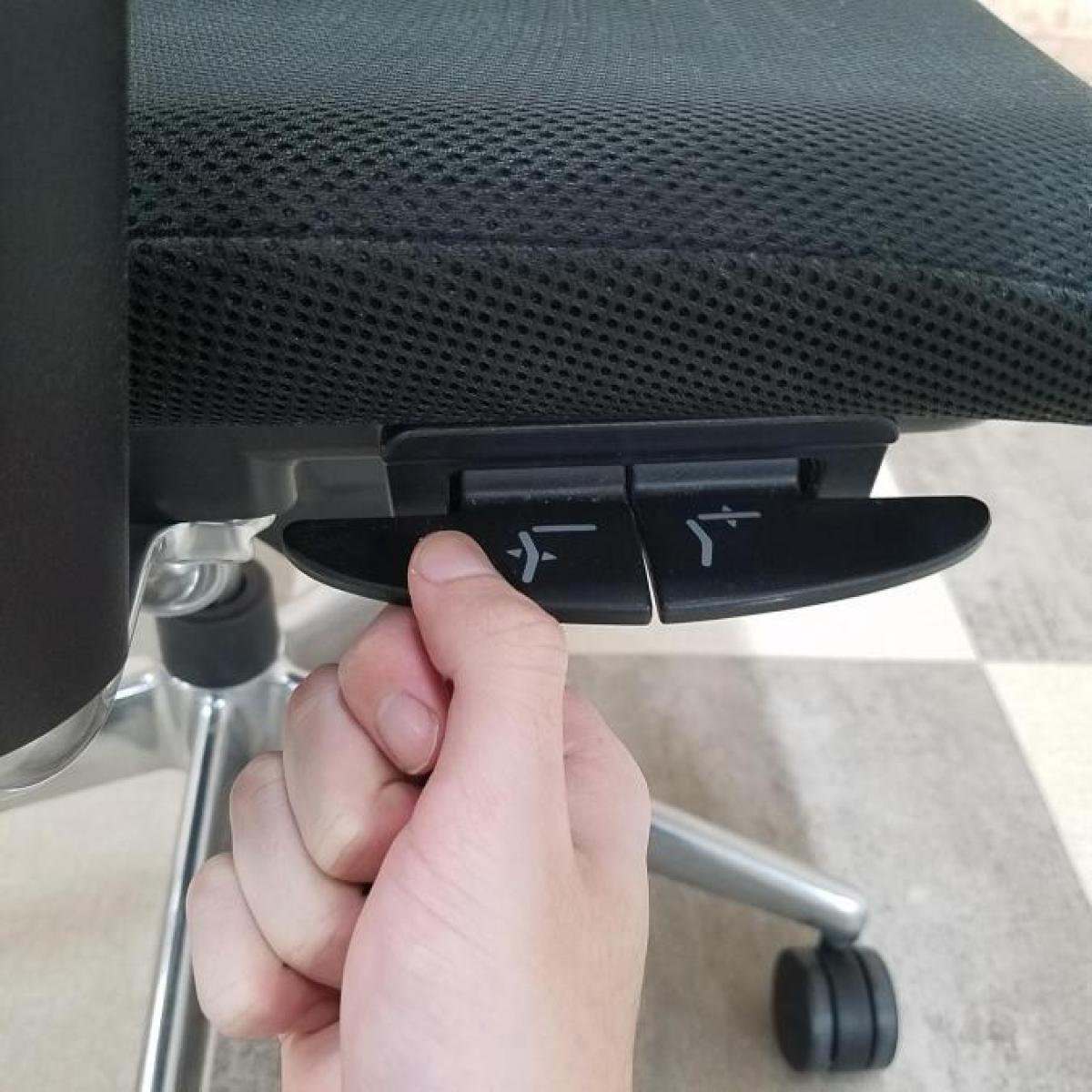 - 座る人の体格に合わせて、シート奥行きは前後54mm、高さ100mmの調整が可能です。また、調整レバーを座面シートの側面に設けることで、座ったままの姿勢で操作することができます。