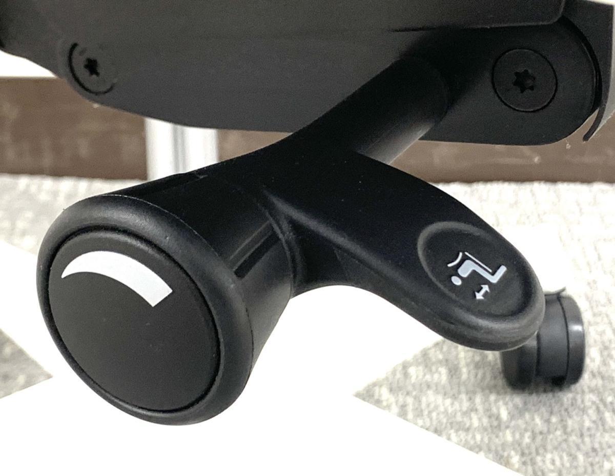 - 座面右下のダイヤル操作で、リクライニングの強弱調整が行えます。これまでのダイヤル式よりも、少ない回転数で、最弱?最強の調整が可能です。