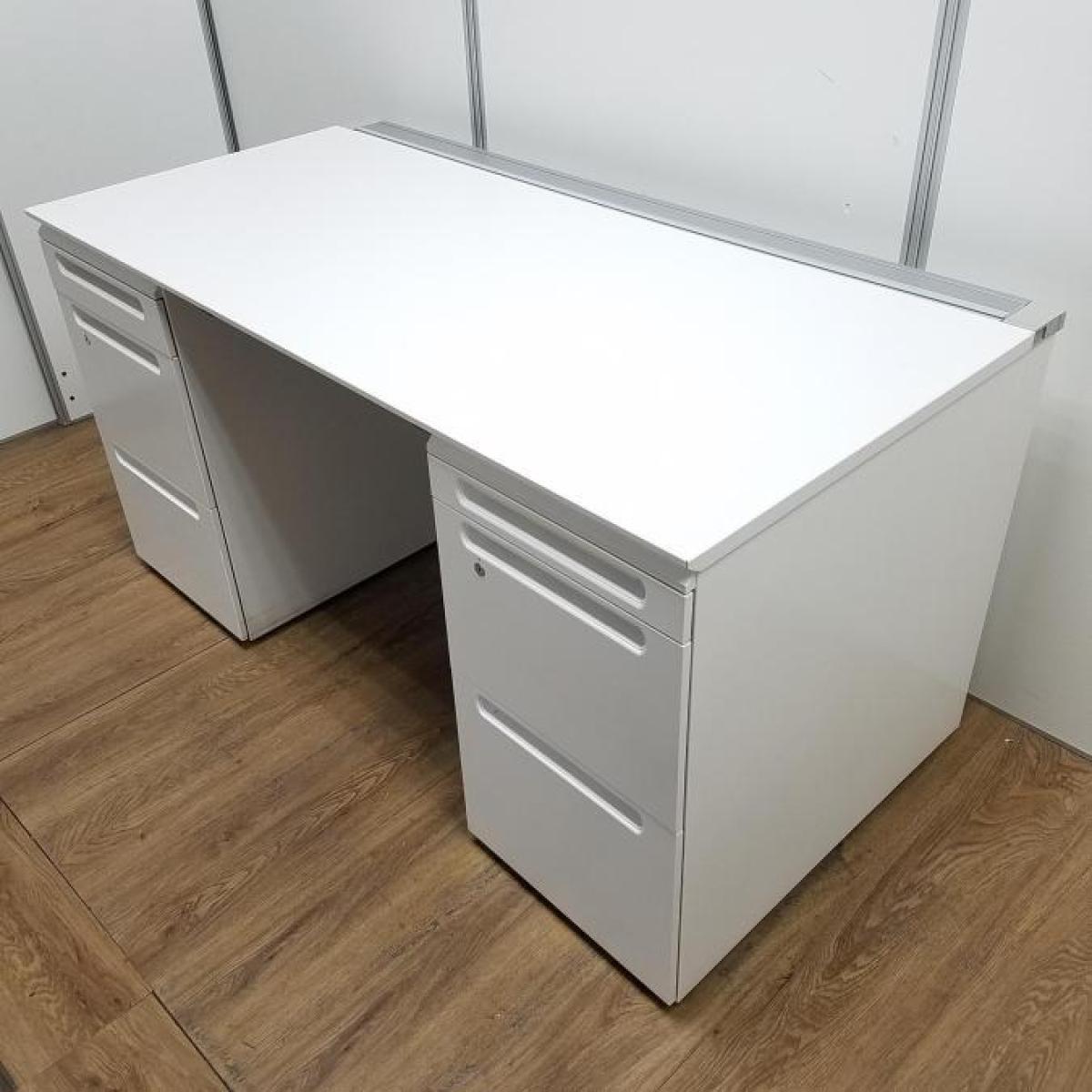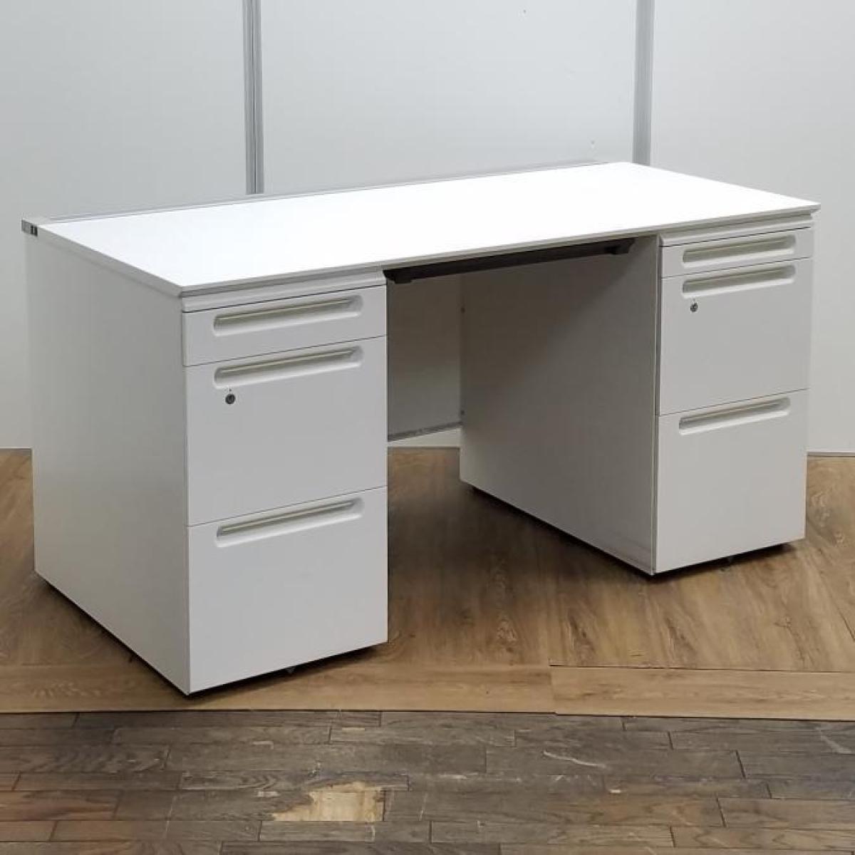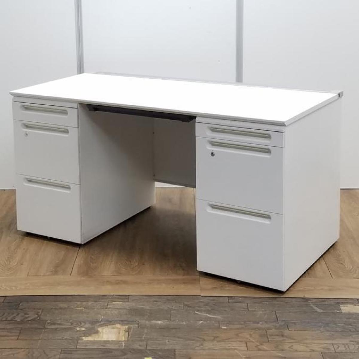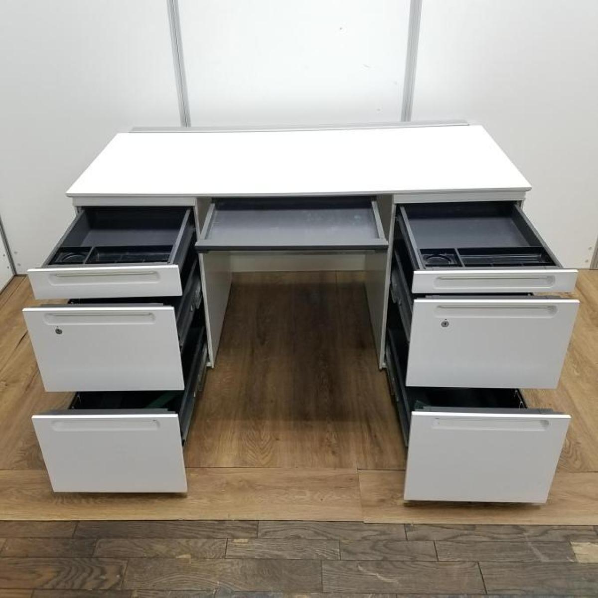 【商品入替のため、残り1台限り】クロガネ製 FUシリーズ ホワイト 左右で6段の収納引出し 広々としたワークスペースW1400サイズ・収納も充実! W1400両袖机!!- 京都東寺店