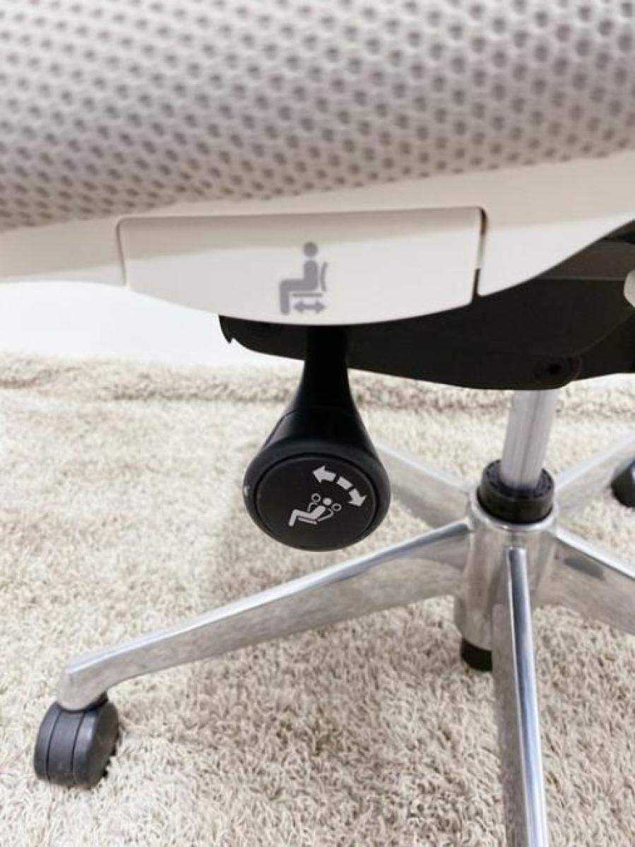 - 座面右下のダイヤル操作で、リクライニングの強弱調整が行えます。これまでのダイヤル式よりも、少ない回転数で、最弱?最強の調整が可能です。