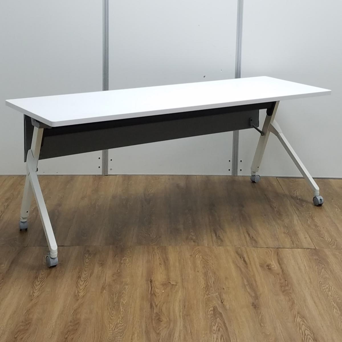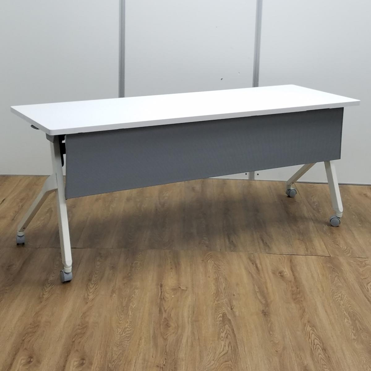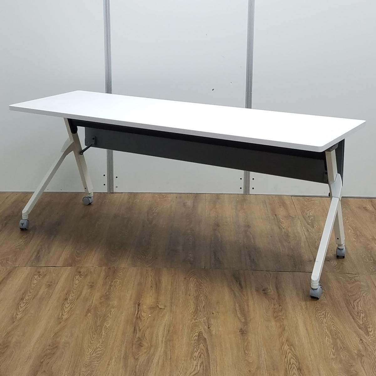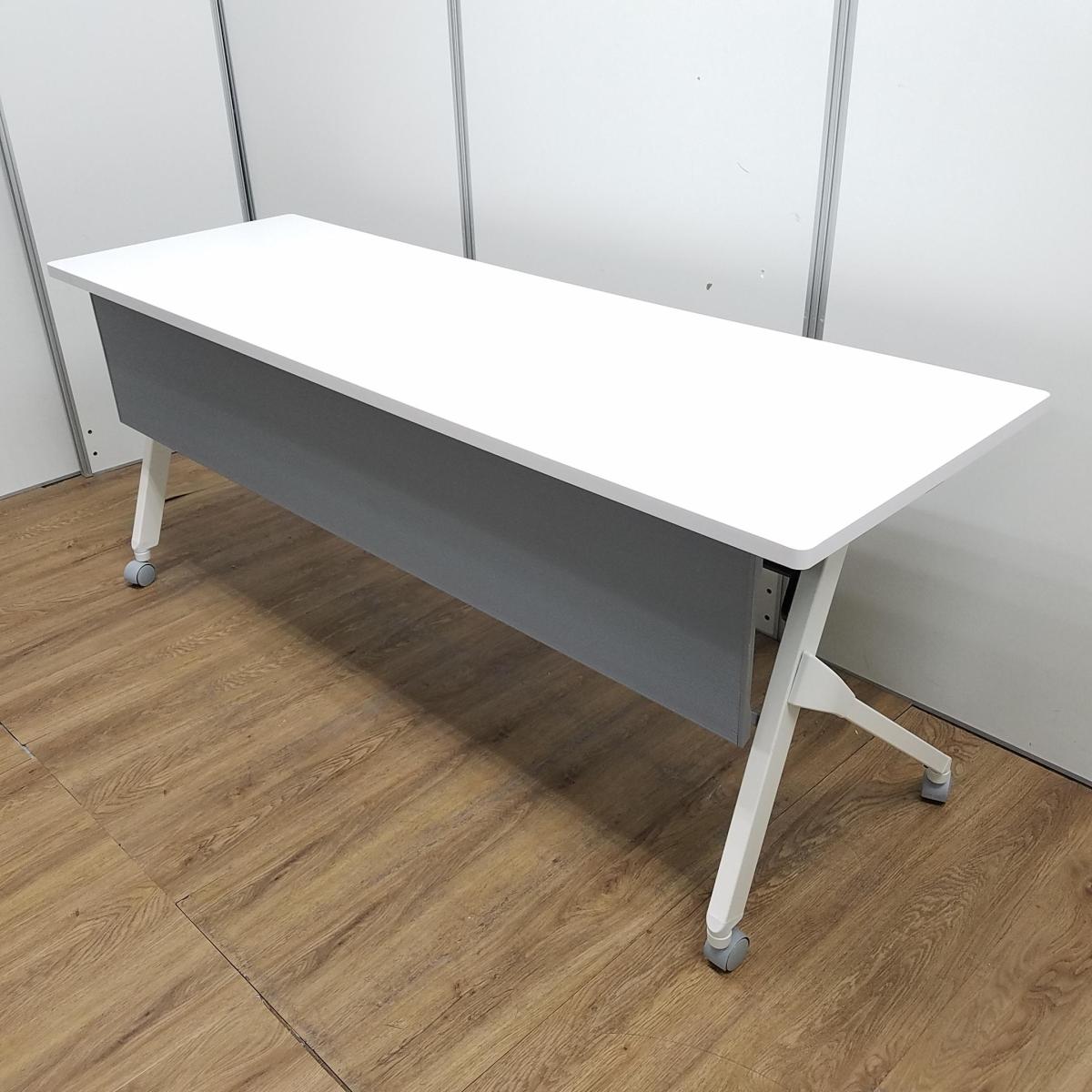 【ロット入荷】オカムラ製 フラプターシリーズ ホワイト W1800/D600/H720サイズ 幕板付 スムーズに移動できるキャスター付きテーブルを便利な折り畳み収納で! W1800サイドスタックテーブル!!- 京都東寺店