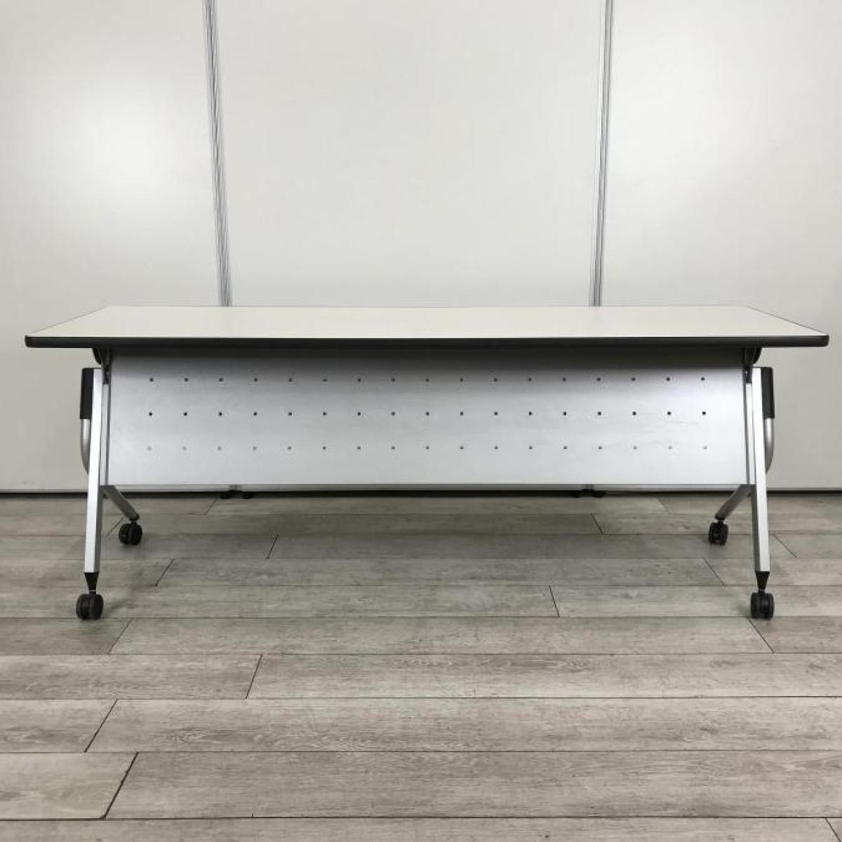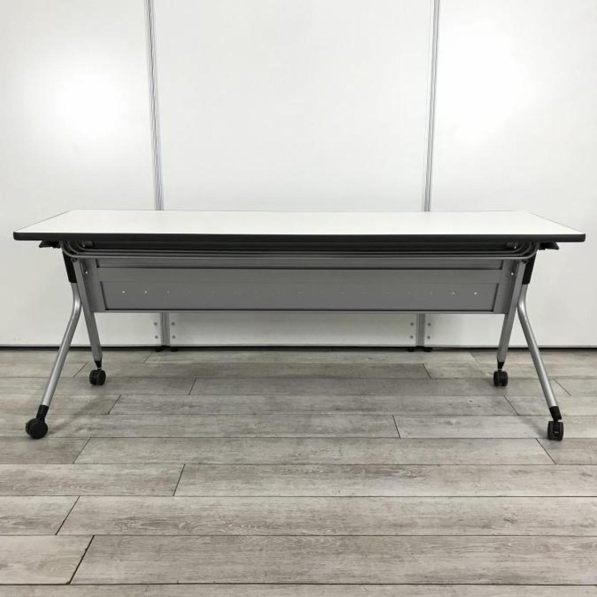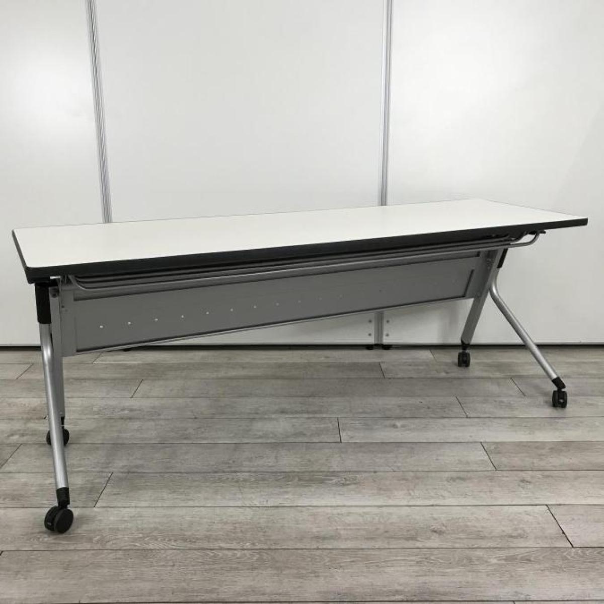 臨時スペースや会議室に人気の折りたたみテーブル!2~3名での使用におすすめです! ■プラス/リネロ2/ホワイト 天板跳ね上げ式 フラップテーブル 幅1800㎜奥行600㎜タイプ- 立川・八王子店