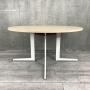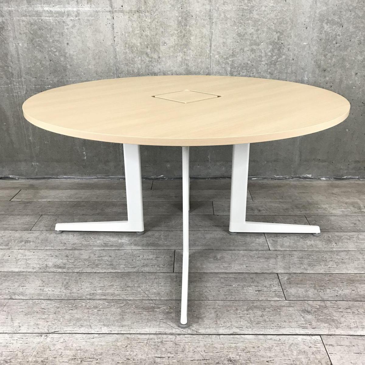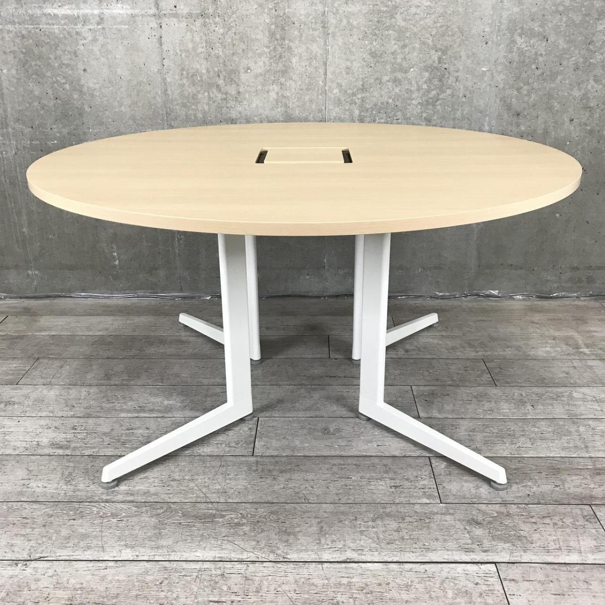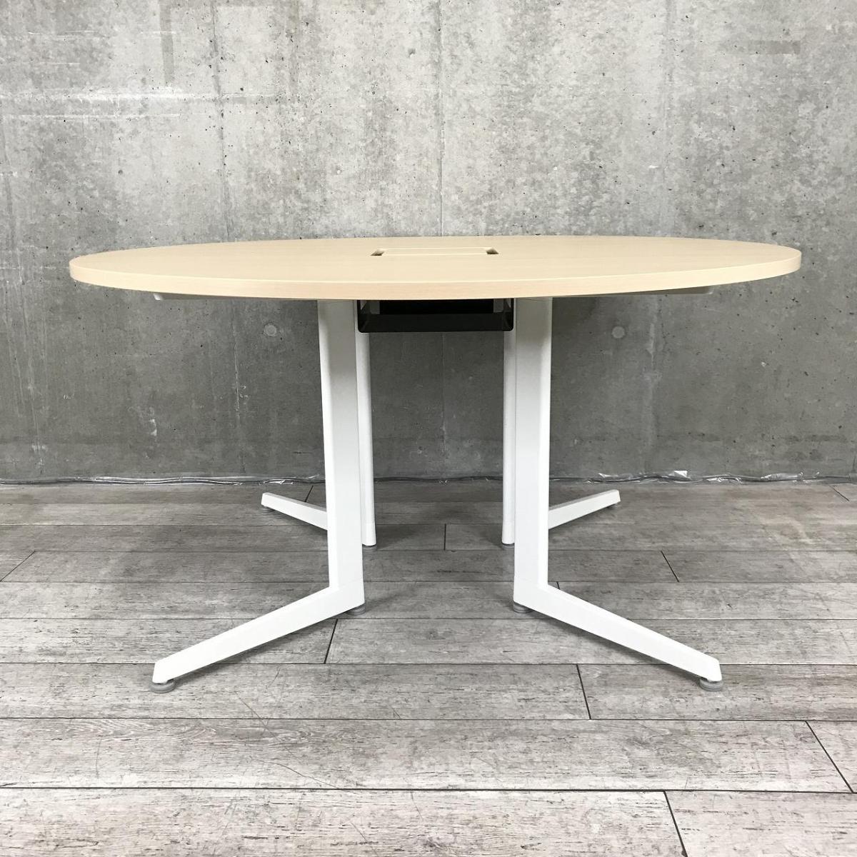 木目調の丸天板にしっかりとしたホワイト色の脚が特徴のミーティングテーブルです。
