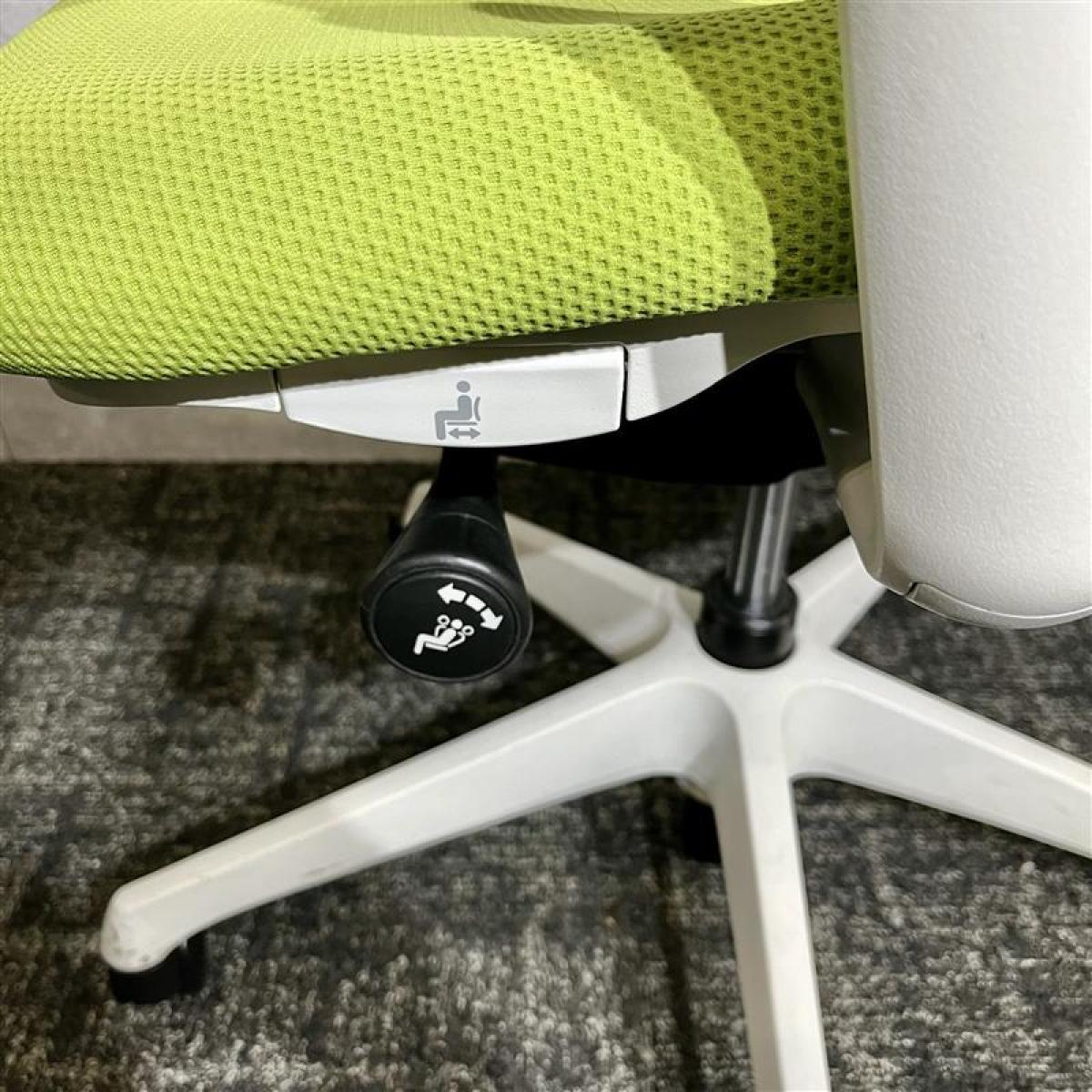 【いま人気のワーキングチェア!新感覚のオフィスシーティング!】■オカムラ シルフィーチェア 可動肘付 ライムグリーン ハンガー付 ※肘に擦れがあるためお安く!【前傾チルト機能付】【A01040979】