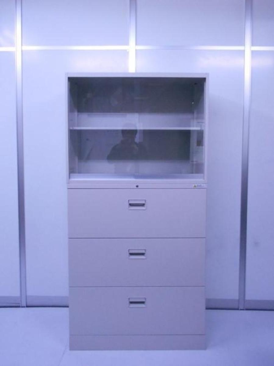 オカムラ製の42シリーズ、ガラス引き違い+3段ラテラル書庫