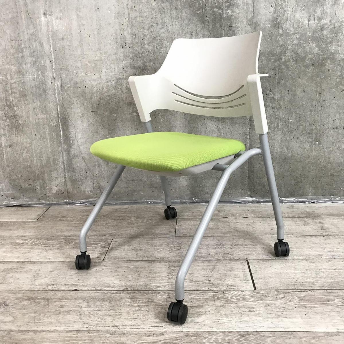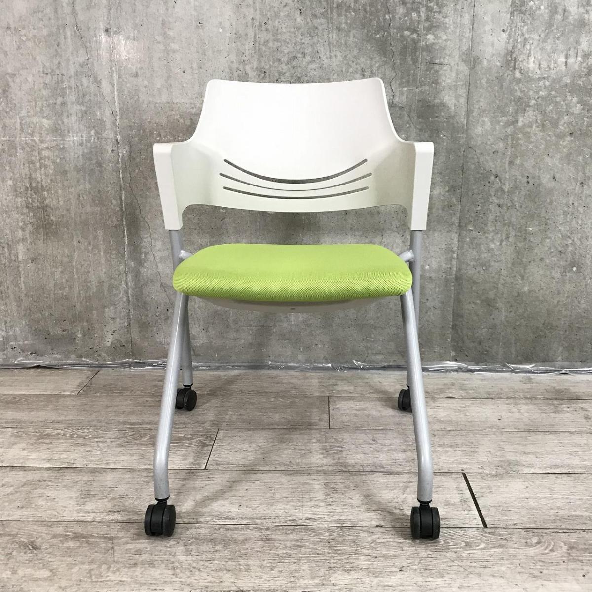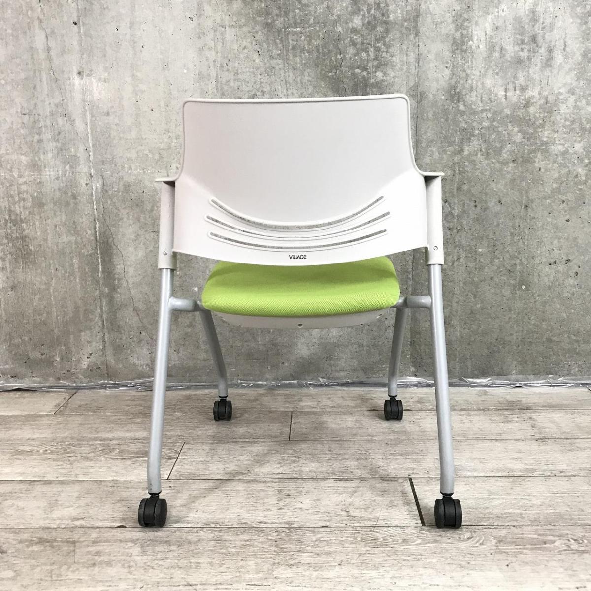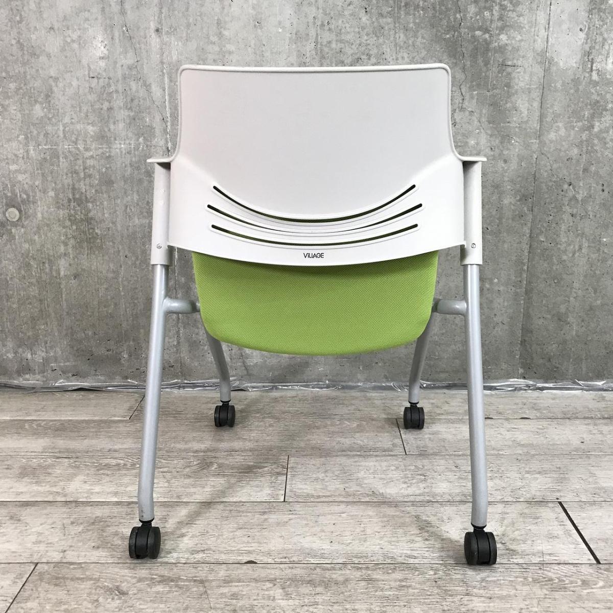 【背を包み込むような安定感のあるデザイン!ミーティングに最適!】■オカムラ(okamura)製 ビラージュ(VILLAGE) ネスティングチェア 肘付き ■キャスター付き ■グリーン×背面樹脂 ホワイト新古