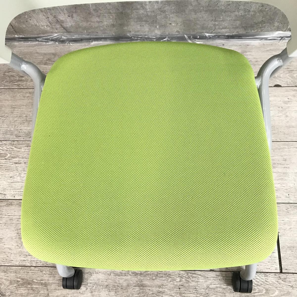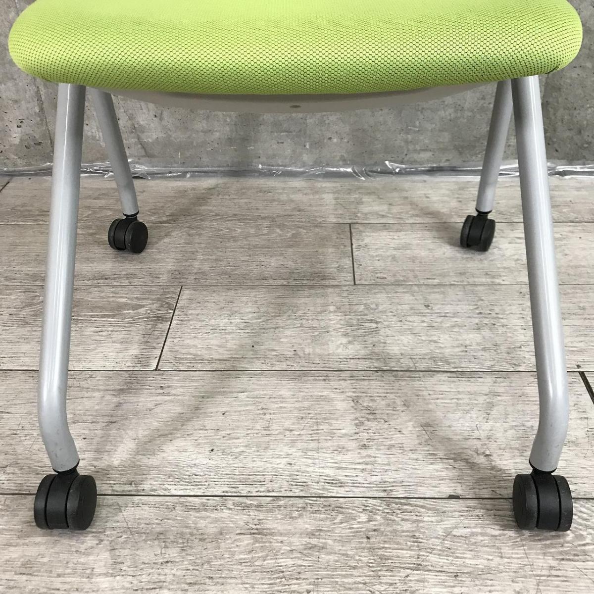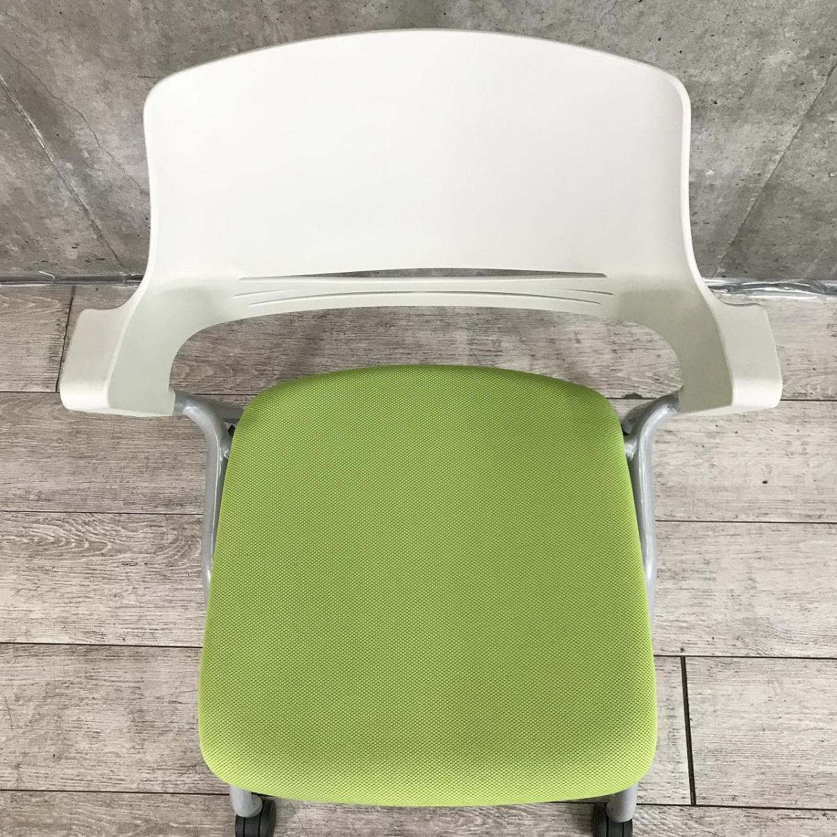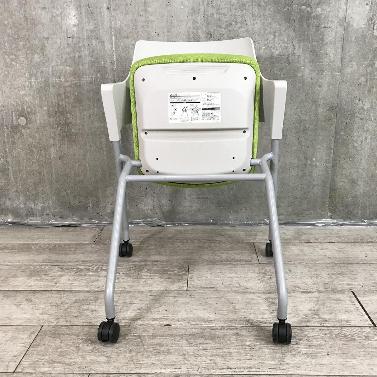 【背を包み込むような安定感のあるデザイン!ミーティングに最適!】■オカムラ(okamura)製 ビラージュ(VILLAGE) ネスティングチェア 肘付き ■キャスター付き ■グリーン×背面樹脂 ホワイト新古