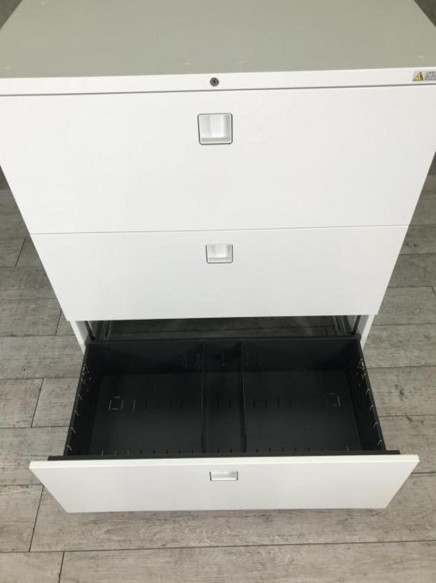 【使いやすさで選ぶならコレ!大容量の三段キャビネット】■オカムラ(Okamura)製 レクトラインシリーズ(Rectline) 3段ラテラル書庫 ローキャビネット ■天板付き ■シリンダー錠 ■ホワイト
