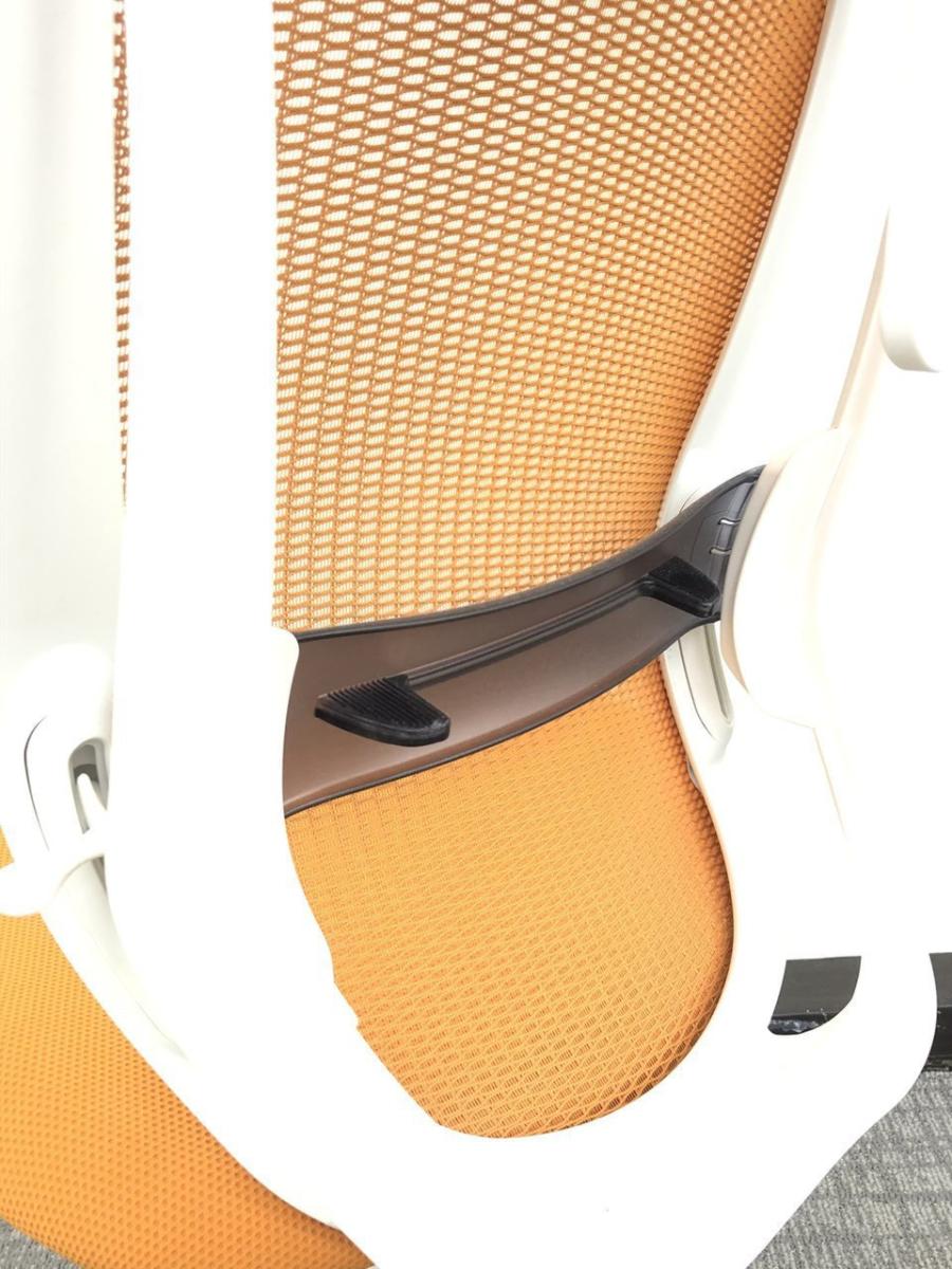 - 座面右下のダイヤル操作で、リクライニングの強弱調整が行えます。これまでのダイヤル式よりも、少ない回転数で、最弱?最強の調整が可能です。