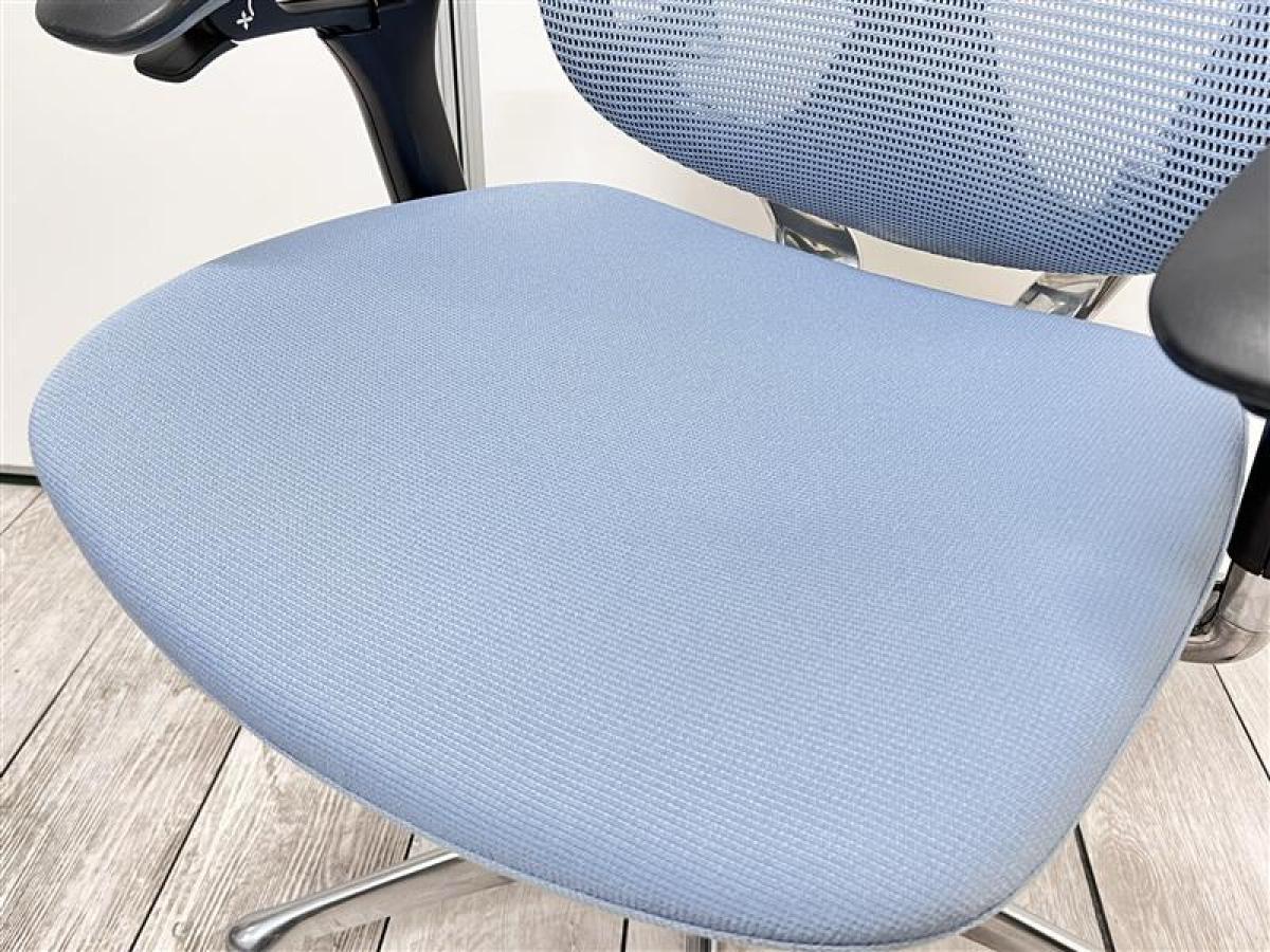 【K9】【商品入替のため、残り7脚限り】【座面に使用感の汚れあり】オカムラ製 コンテッサシリーズ ライトブルー 背面メッシュ ランバーサポート付 可動肘 世界で認められた革新的タスクチェア! 人間工学に基づいた快適な座り心地を実現! 肘付きハイバックチェア!!