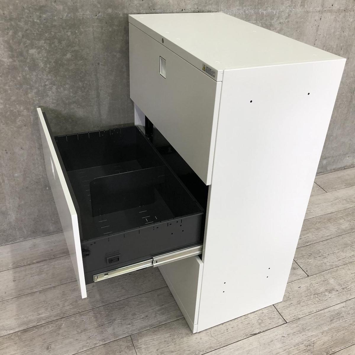 【使いやすさで選ぶならコレ!大容量の三段キャビネット】■オカムラ(Okamura)製 レクトラインシリーズ(Rectline) 3段ラテラル書庫 ローキャビネット ■天板付き ■シリンダー錠 ■ホワイト