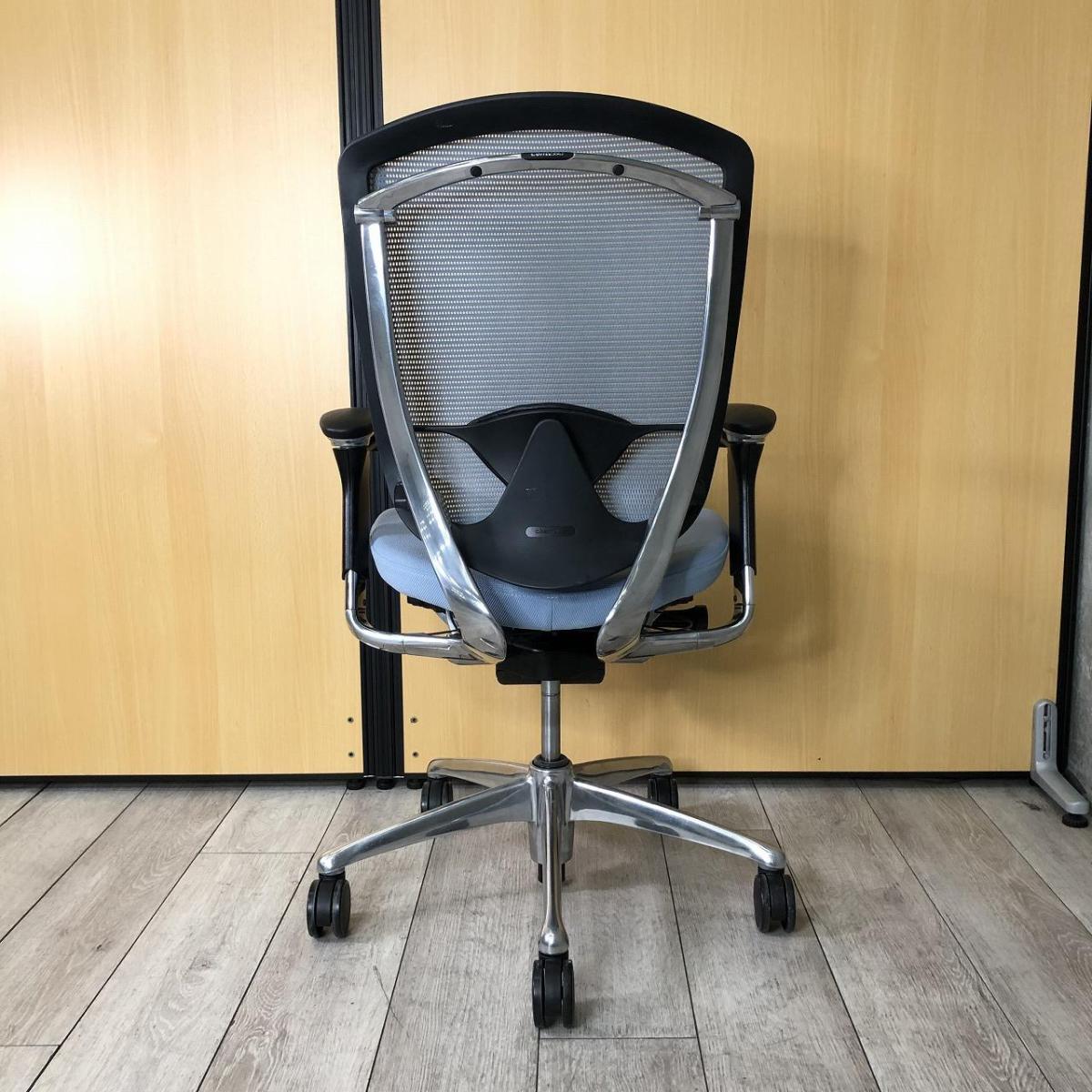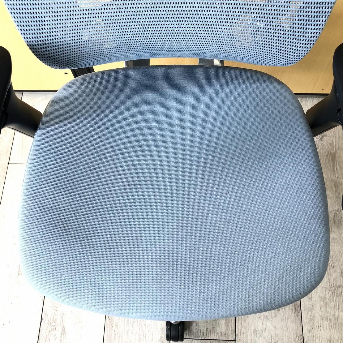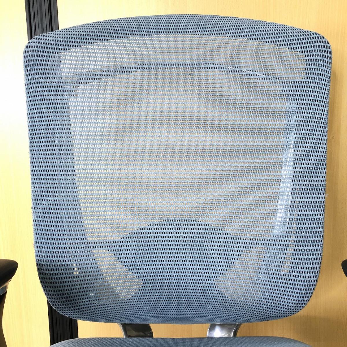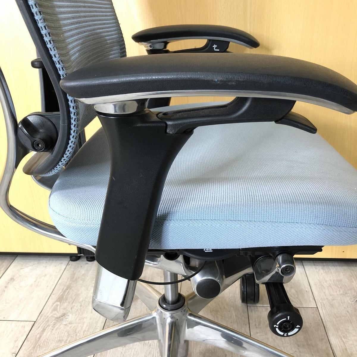【K9】【商品入替のため、残り7脚限り】【座面に使用感の汚れあり】オカムラ製 コンテッサシリーズ ライトブルー 背面メッシュ ランバーサポート付 可動肘 世界で認められた革新的タスクチェア! 人間工学に基づいた快適な座り心地を実現! 肘付きハイバックチェア!!