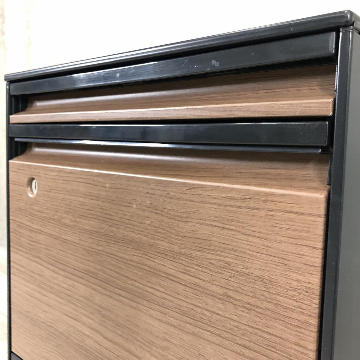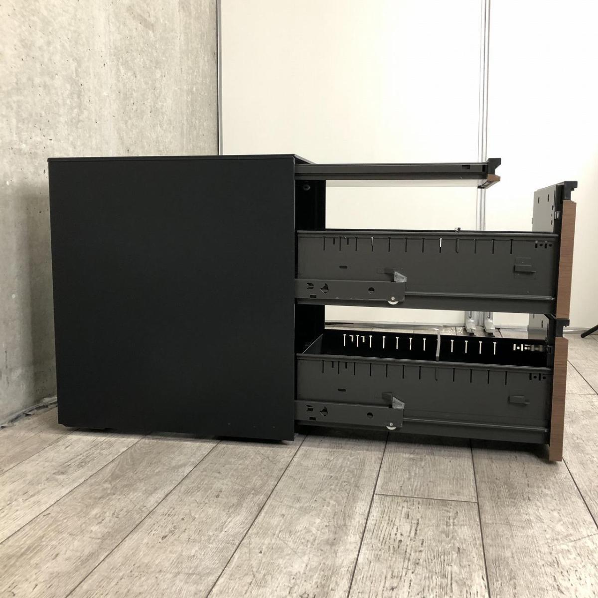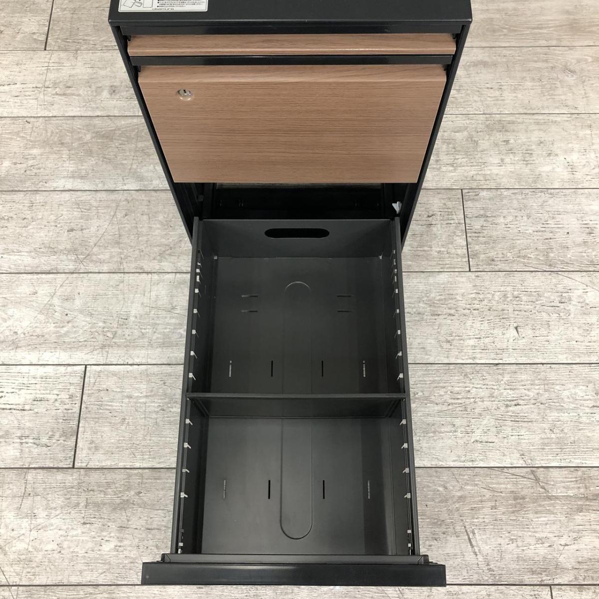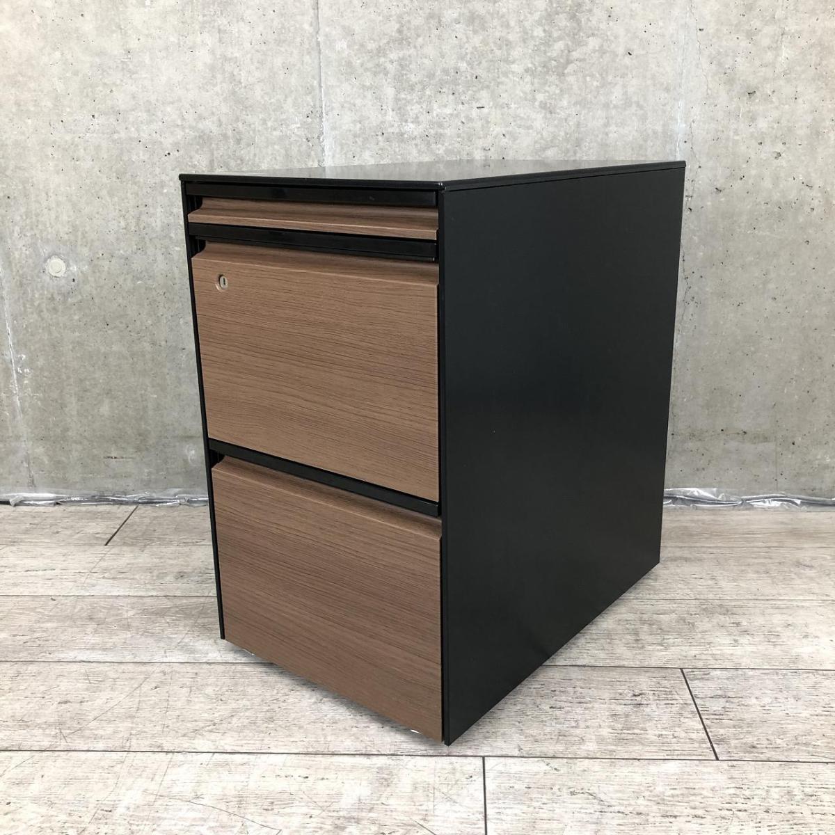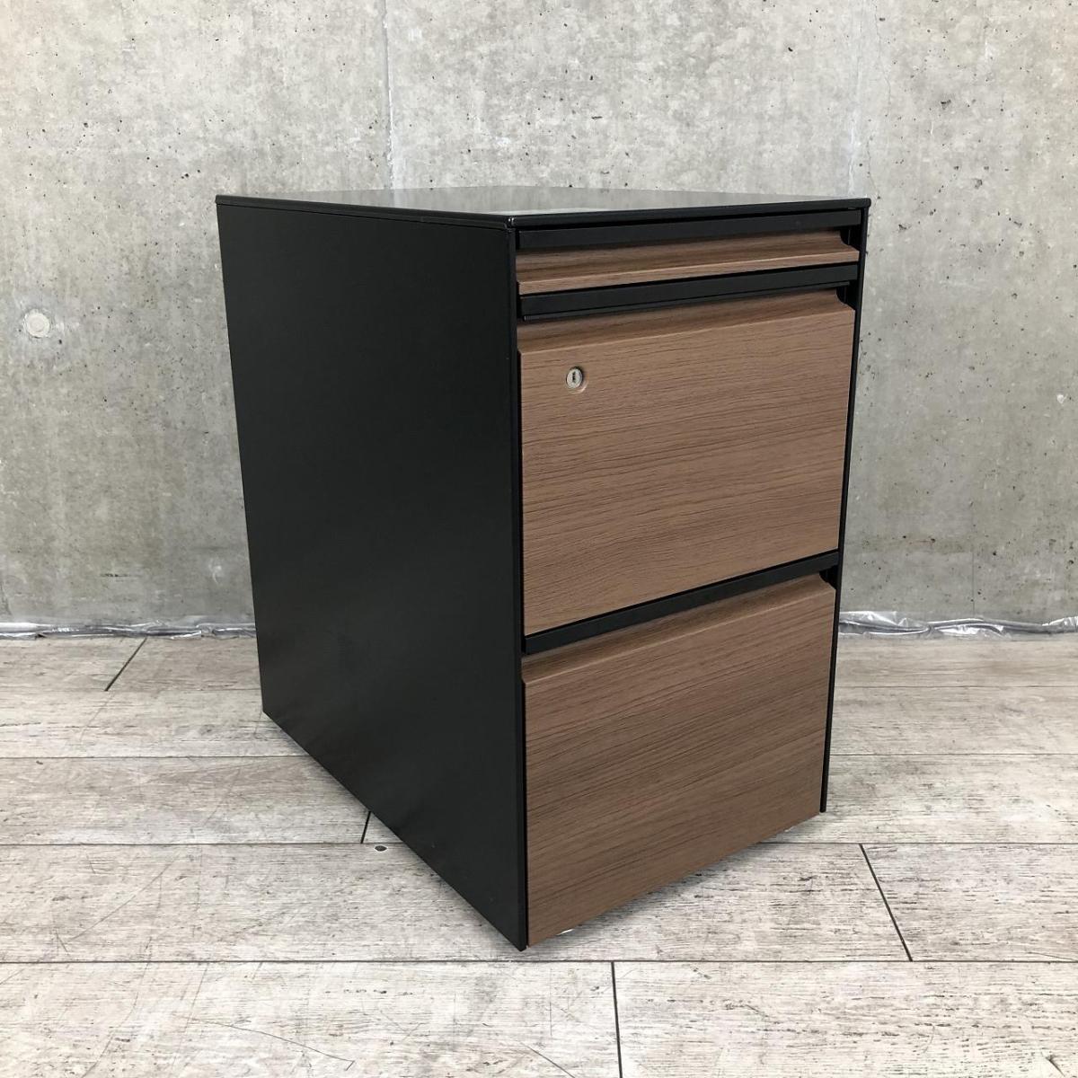 【超レアな表面木目柄のおしゃれなワゴンが入荷!】■オカムラ(okamura)プロステージクレストシリーズ 3段ワゴン ■色:本体/ブラック 正面/木目ダーク ■シリンダー錠- 品川・三田店