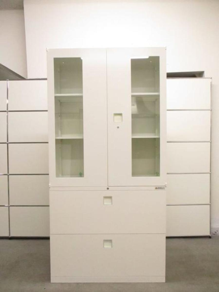 スライド式の扉+引き出しタイプの便利な書庫セットが入荷!使い勝手抜群のハイキャビネットが入荷! ■オカムラ/レクトライン/ホワイト 2枚引き戸+3段ラテラルキャビネット