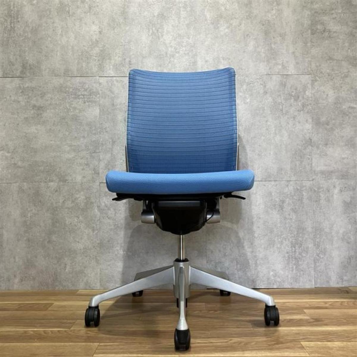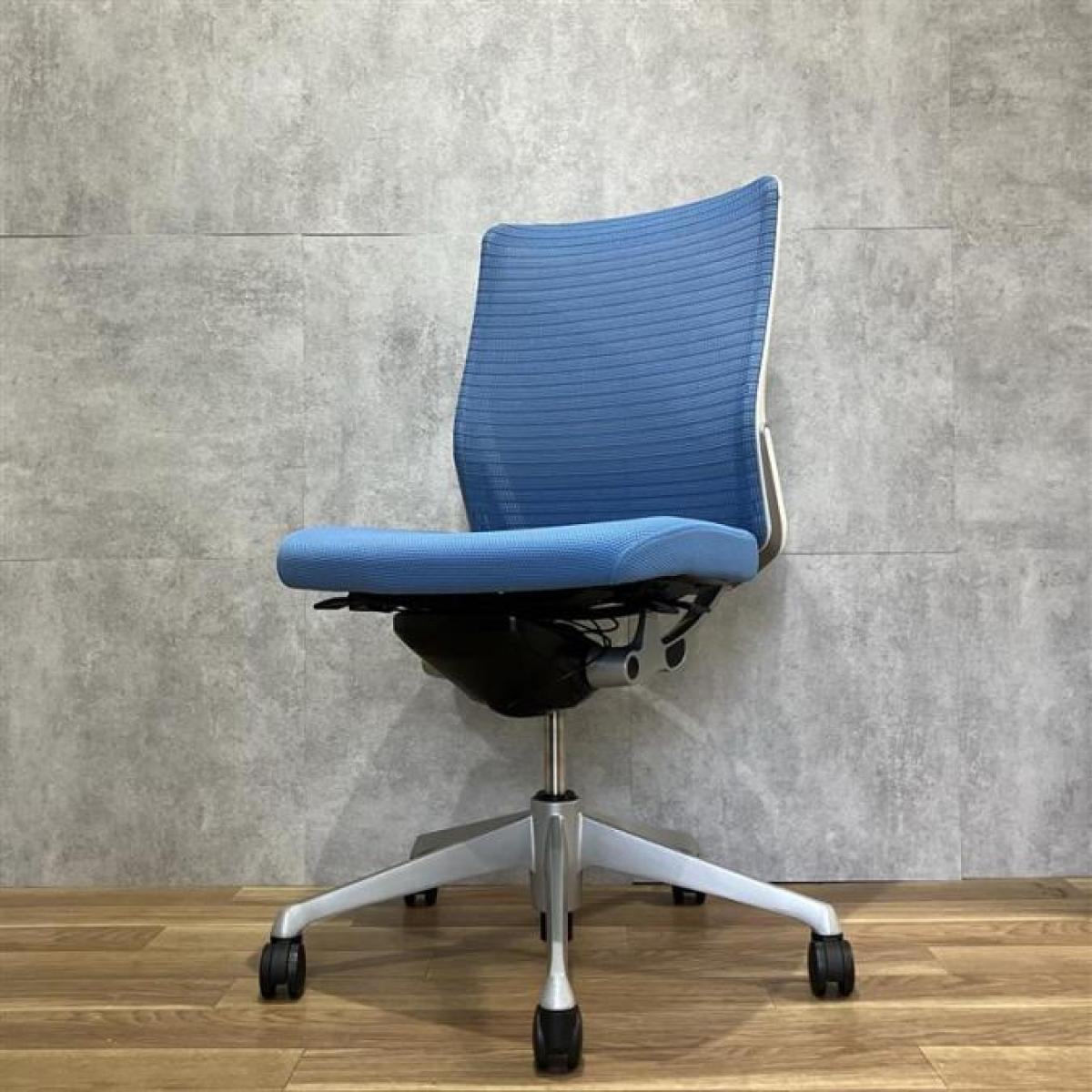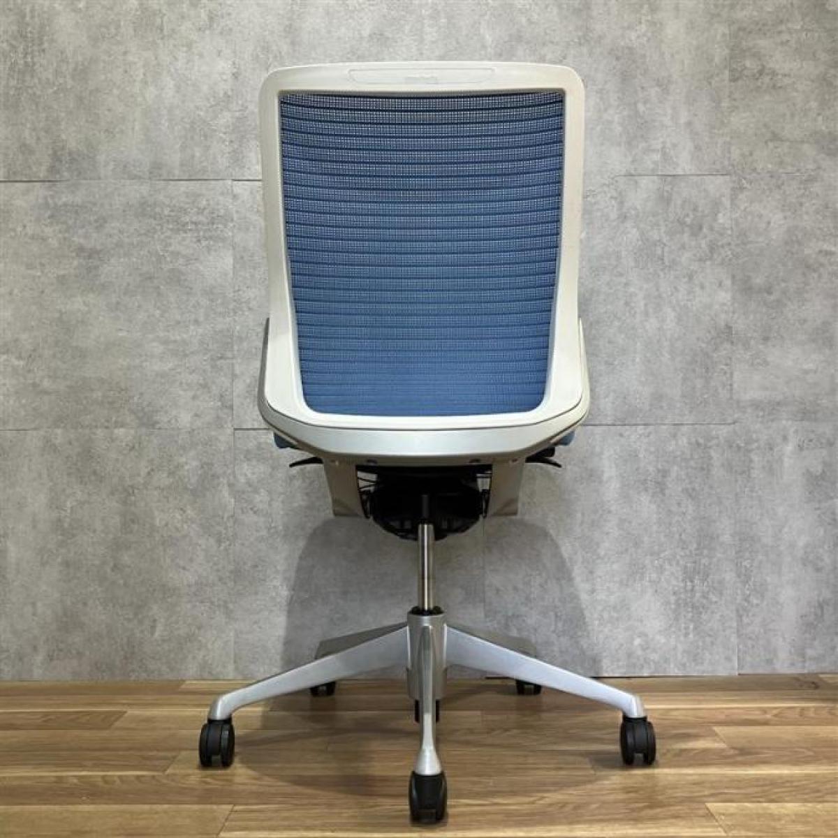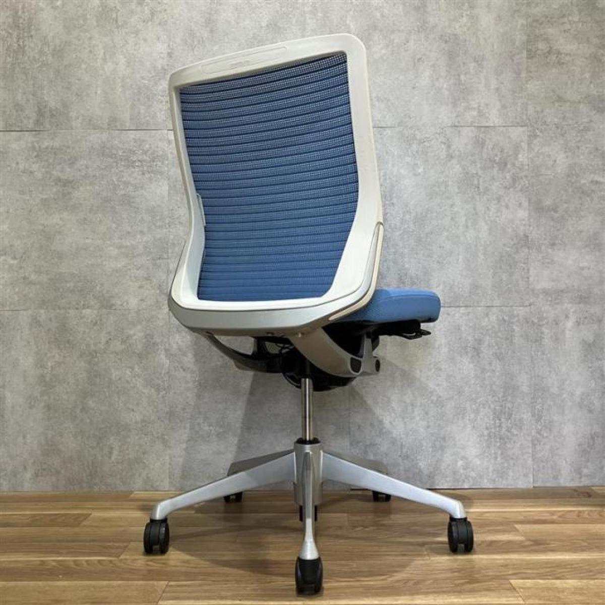 【機能性抜群の人気チェア!自然な姿勢をサポートするアンクルチルトリクライニング搭載!】■オカムラ(okamura)製 コーラルチェア(Choral) 肘無ミドルバックチェア 背面メッシュ ■ランバーサポート・コートハンガー付き ■ブルー×ブラックシェル
