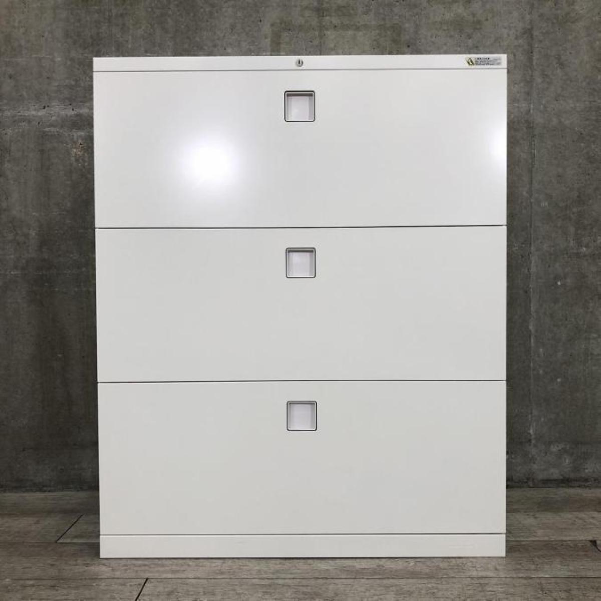 【ファイル収納にオススメ!高品質で使いやすい人気シリーズの3段ラテラル書庫!】■オカムラ(okamura)製 レクトラインシリーズ 3段ラテラル書庫 ローキャビネット H1100㎜ ■ホワイト ■シリンダー鍵 ■天板付き(天板:ホワイト) ※日焼け有
