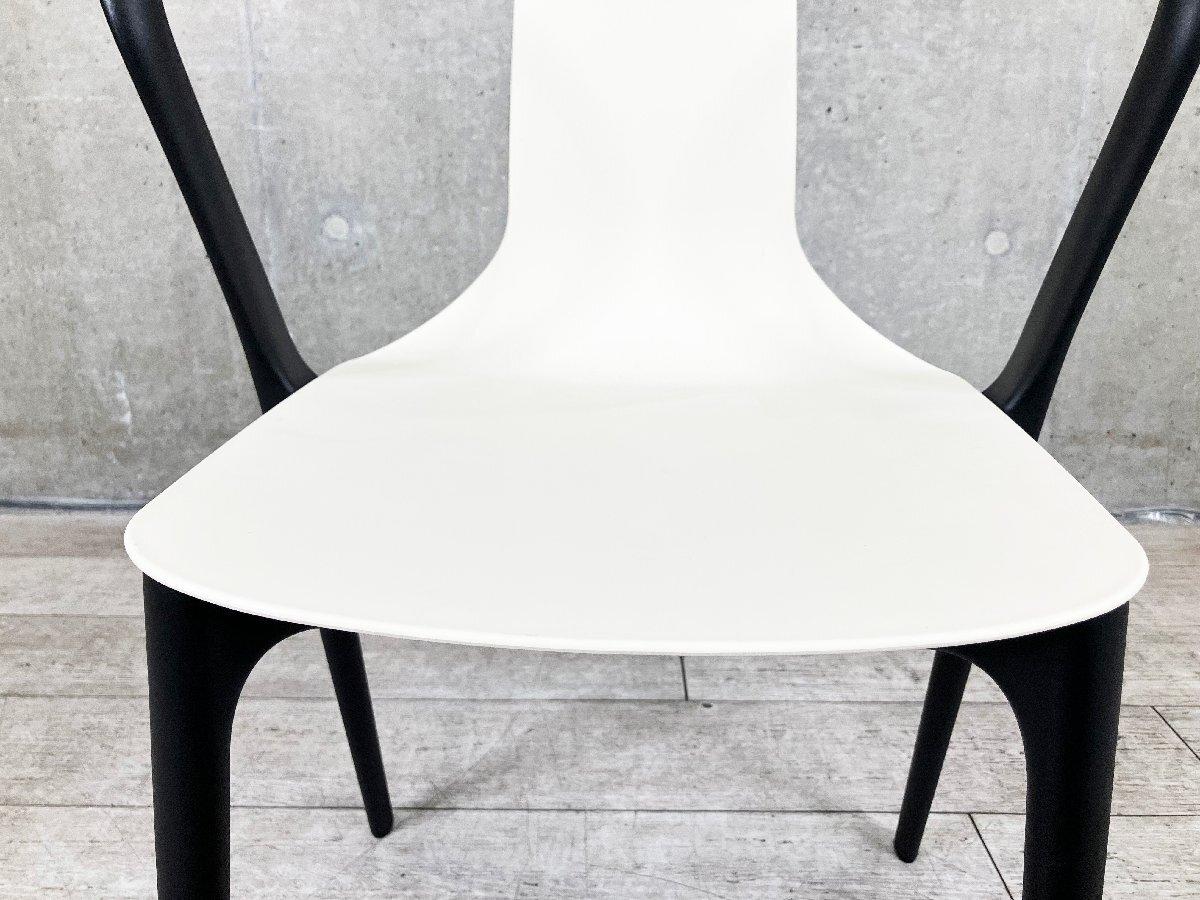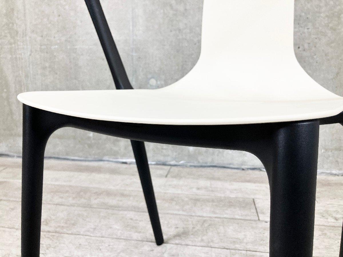 この椅子の最大の特徴はシートシェルです。シートシェルは、ベルヴィルチェアのアイデンティティとなる部分であり、素材や色に応じてイメージが変化します。スレンダーな黒のフレームは、脚や背面に向かって書道の線を思わせるようなラインを描いています。一方シートシェルは、広めの座面が背もたれにかけて細くなっていき、非常に薄いシェルを支えています。