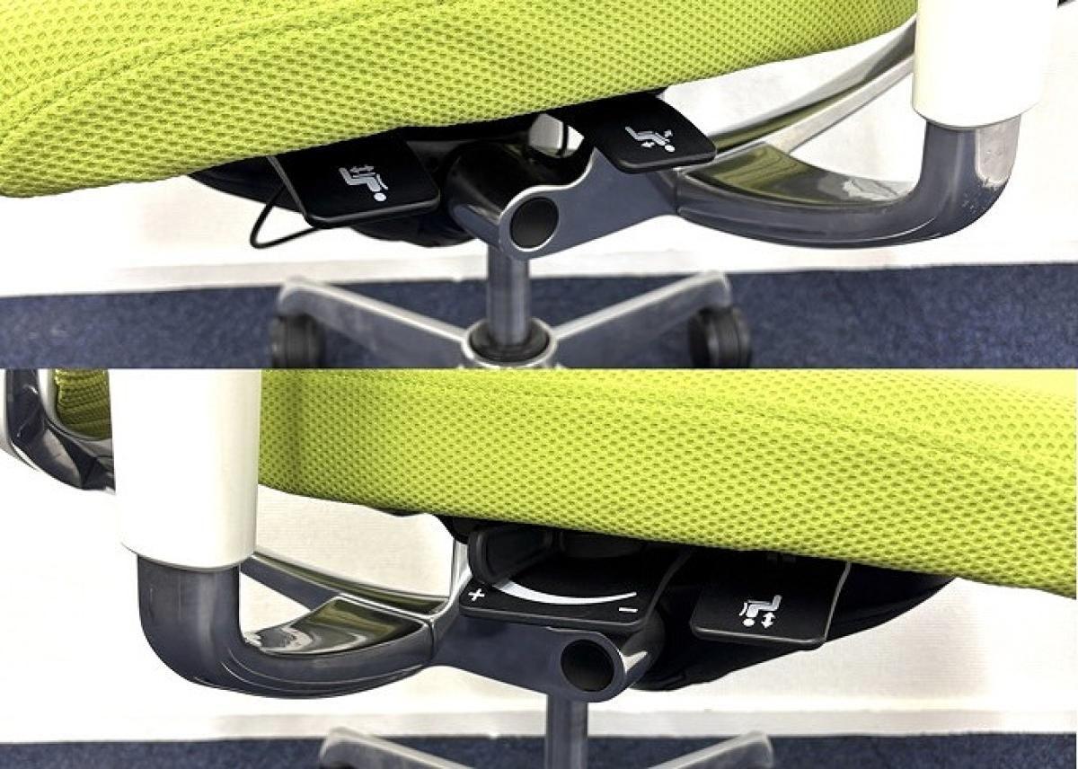 - リクライニングの固定と解除、リクライニング反力の強弱、座面の高さ調整、座面のスライド調整の操作を、すべて座面の裏側に集約。すべての調整を無駄な動きをすることなく、座ったままの状態で行えます。