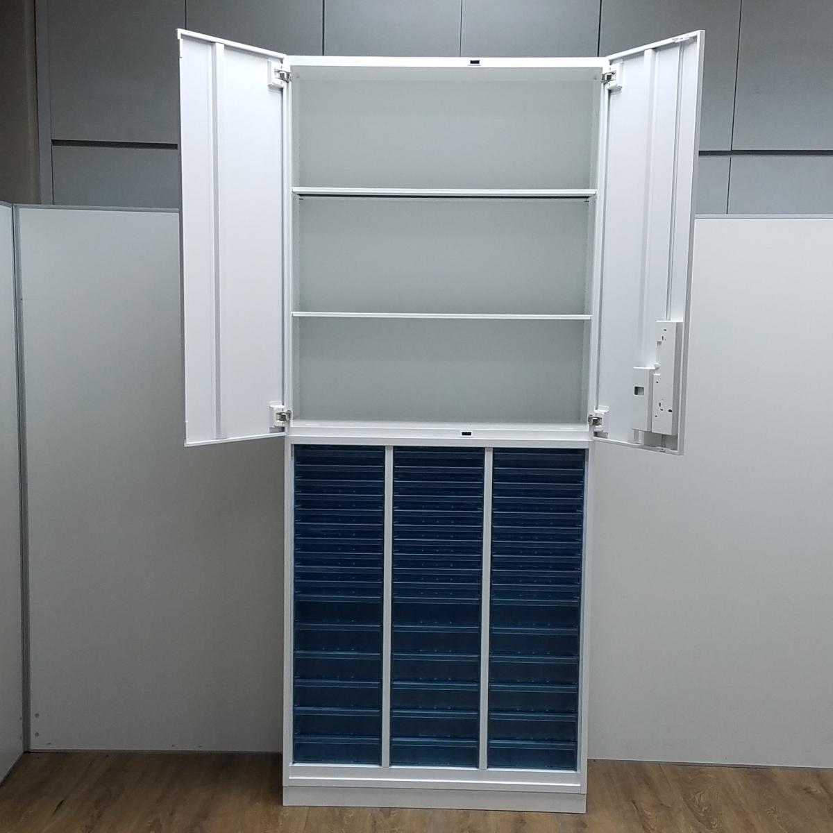 【両開き書庫とクリスタルトレイキャビネットの上下書庫セットの入荷です】 ■コクヨ/エディア/ホワイト 両開き+クリスタルトレー 深型3列11段 計33段