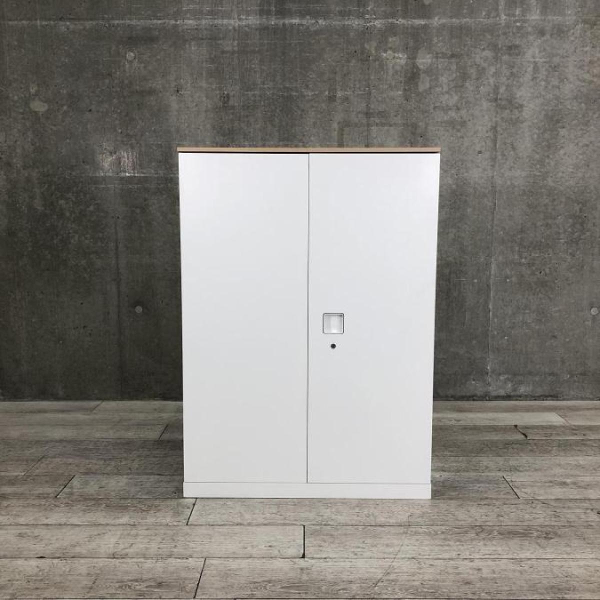 【オフィスの書類をスッキリ整理!取っ手がどの方向からでも開くマルチハンドル!】■オカムラ(okamura)製 レクトラインシリーズ 両開き書庫 ローキャビネット ■本体色:ホワイト ■シリンダー錠 ■ナチュラル天板付き