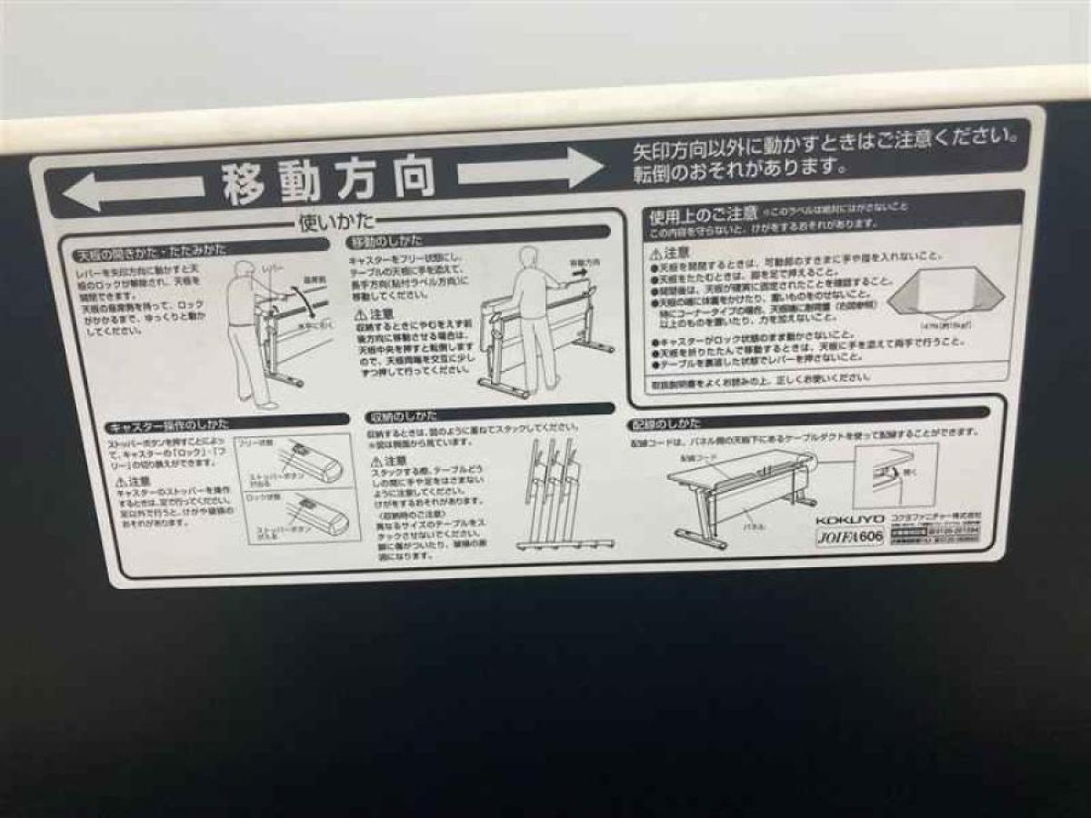 - 一部不具合あり天板歪み、アジャスター無し、キャスター使用不可ようなそのテーブルの本来の効用を果たすための機能以外の一部が使用不可な状態。(例、キャスターロッ ク機能使用不可、棚板無し等がある。)