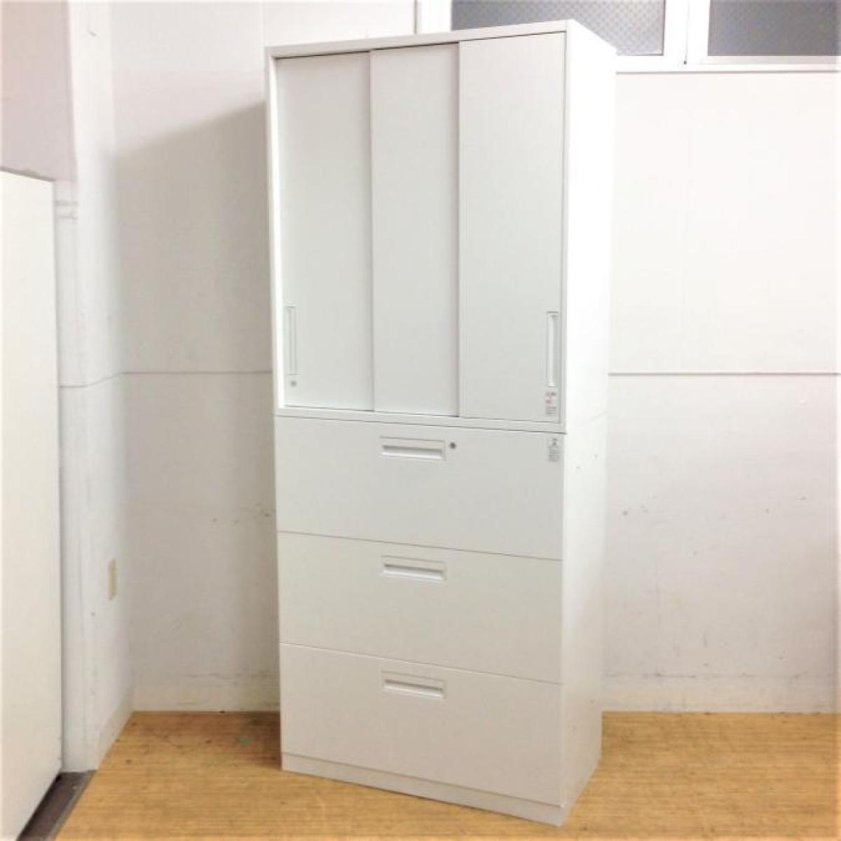 【オフィスの書類をまとめて整理!引き違いと引き出し式の書庫セット!】■コクヨ(KOKUYO)製 エディア(EDIA) 引き違い+3段ラテラル 上下書庫セット 2枚扉 H2150㎜ ■シリンダー錠 ■ホワイト